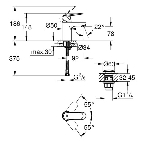 GROHE Waschtisch-Einhebelmischer Eurosmart Cosmopolitan 1/2", S-Size, glatter Körper, mit Push-open Ablaufgarnitur, chrom