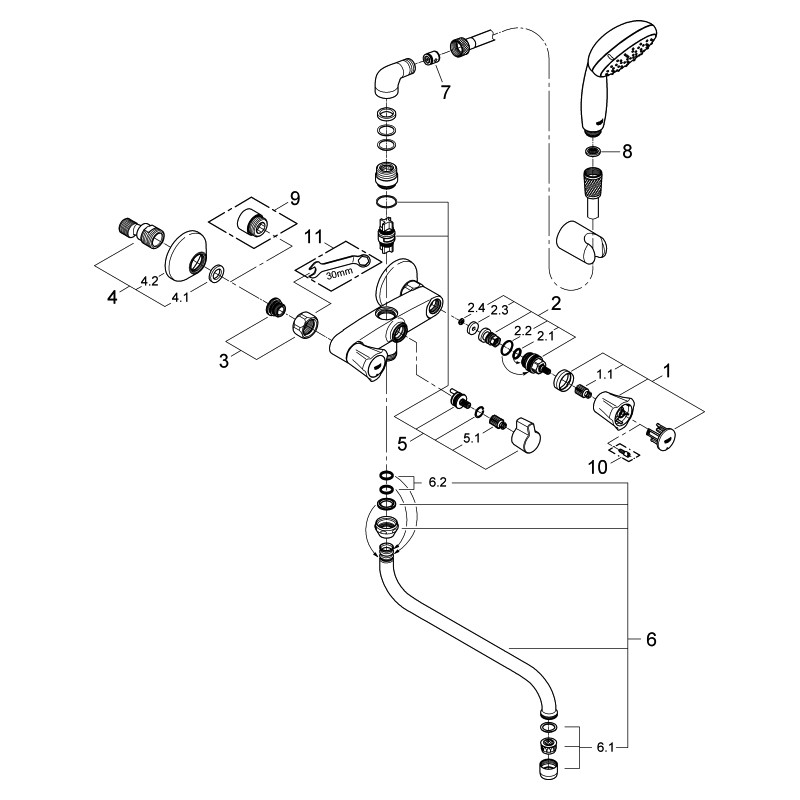 Metallgriffe, wärmeisoliert, verschraubbar, Long-Life-Oberteil, Umstellung Wanne/Brause, S-Anschlüsse, Anschlusswinkel 3/4" x 3/4" (12 419), Auslauf 30 cm (13 017), Handbrause Tempesta 100, 1 Strahlart, 9,5 l/min (27 923), Relexaflex-Brauseschlauch 150 cm (28 151), Handbrausehalter (28 605), Long-Life Oberfläche