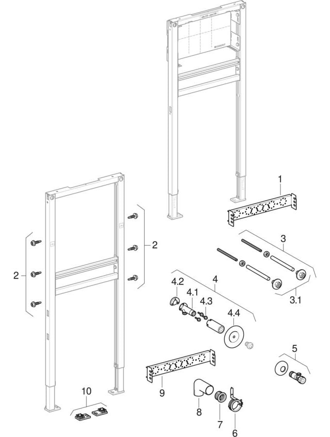zum Einbau in teil-/raumhohe Vorwandinstallationen und in raumhohe Installationswände, zur Montage von Waschtischen, für Standarmaturen, für Fußbodenaufbauten 0-20 cm, selbsttragender Rahmen pulverbeschichtet, Rahmen mit Bohrlöchern Ø 9 mm für Befestigung im Holzständerbau, Rahmen mit Aufnahmelöchern für DuofixBasic Wandanker für Elemente mit Rahmen oben offen, Fußstützen verzinkt und verstellbar 0-20 cm, Fußplatten aus Kunststoff, Tiefe passend zum Einbau in U-Profile UW 50, Befestigungsabstand Waschtisch 5-38 cm, Befestigung für Anschlussbogen höhenverstellbar und schallgedämmt, Traverse Armatur höhen- und tiefenverstellbar, bestehend aus 2x Wandanker, Anschlussbogen aus PE-HD-Ø 50 mm, Dichtung Ø 44/32 mm, Traverse für Beplankungsauflage, 2x Gewindestangen M 10 und Befestigungsmaterial