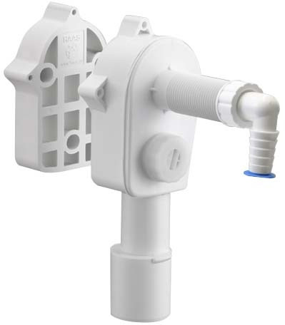 aus schlagfestem Polypropylen, mit Reinigungsöffnung, mit 3/4" Winkeltülle und Überwurfmutter verchromt, komplett mit Dichtungen, einzeln im Polybeutel verpackt, nach DIN EN 274