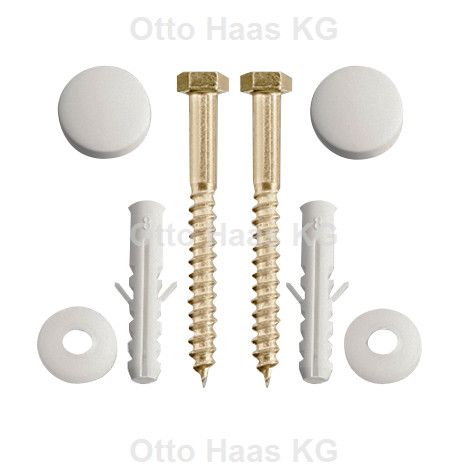 bestehend aus 2x Stück Sechskant-Schrauben 6/70 mm, 2x Stück Dübel Ø 8, 2x Stück PP-Unterlegscheiben, weiss, 2x Stück PP-Deckkappen, weiss