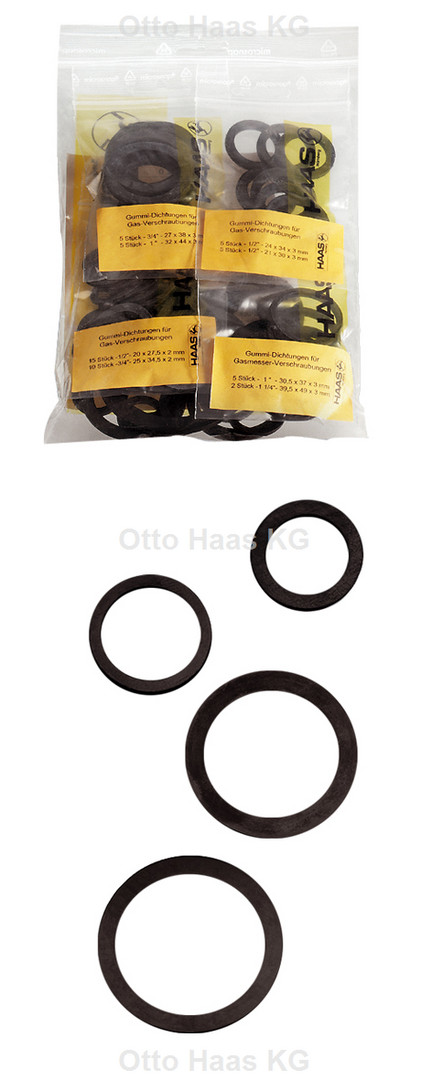 bestehend aus: 2x Gummi-Dichtungen "DVGW" 3/8", 16 x 23,5 x 2 mm, 15x Gummi-Dichtungen "DVGW" 1/2", 20 x 27,5 x 2 mm, 10x Gummi-Dichtungen "DVGW" 3/4", 25 x 34,5 x 2 mm, 2x Gummi-Dichtungen "DVGW" 1", 31 x 41 x 2,5 mm, 2x Gummi-Dichtungen 1 1/4", 39 x 50,5 x 2,5 mm, 2x Gummi-Dichtungen "DVGW" 3/4", 22,5 x 29 x 3 mm, 5x Gummi-Dichtungen "DVGW" 1", 30,5 x 37 x 3 mm, 2x Gummi-Dichtungen "DVGW" 1 1/4", 39,5 x 49 x 3 mm, 1x Gummi-Dichtung "DVGW" 1 1/2", 45,5 x 55 x 3 mm, 2x Gummi-Verschraubungsdichtung "DVGW" 1/4"= 3/8", 17 x 24 x 3 mm, 2x Gummi-Gas-Verschraubungsdichtung "DVGW" 3/8", 19 x 27 x 3 mm, 5x Gummi-Gas-Verschraubungsdichtung "DVGW" 1/2" groß, 24 x 34 x 3 mm, 5x Gummi-Gas-Verschraubungsdichtung "DVGW" 1/2" klein, 21 x 30 x 3 mm, 5x Gummi-Gas-Verschraubungsdichtung "DVGW" 3/4", 27 x 38 x 3 mm, 5x Gummi-Gas-Verschraubungsdichtung "DVGW" 1", 32 x 44 x 3 mm, 2x Gummi-Gas-Verschraubungsdichtung "DVGW" 1 1/4", 42 x 55 x 3 mm, 1x Gummi-Gas-Verschraubungsdichtung "DVGW" 1 1/2", 46 x 62 x 3 mm, 1x Gummi-Gas-Verschraubungsdichtung "DVGW" 2", 60 x 78 x 3 mm
