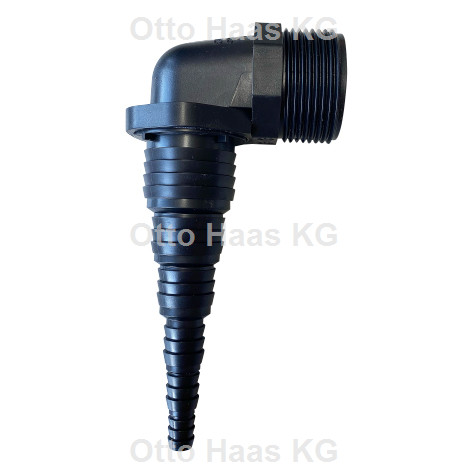 Pumpenanschluss 90° mit Schraubgewinde1¼" für Anschlüsse an Saug- und Druckpumpen, durch kürzen des Schlauchstutzens ist der Verbinder geeignet für metrische und imperiale Schlauchabmessungen von 8,3 bis 33,5 mm, das schlagfeste ABS besticht durch sehr hohe Materialfestigkeit, Abriebfestigkeit, sein geringes Eigengewicht und bietet durch die vorhandenen Rippen eine optimale Verbindung. Durch die vorhandenen Raster wird ein Herausrutschen des Anschlusses erschwert, gute chemische Beständigkeit, Temperaturbereich von 0 °C bis +90 °C und Temperaturbeständigkeit kurzzeitig bis 90 °C, max. Überdruck: 0,8 bar, für Schläuche von 8,3-33,5 mm, PN2 60 °C