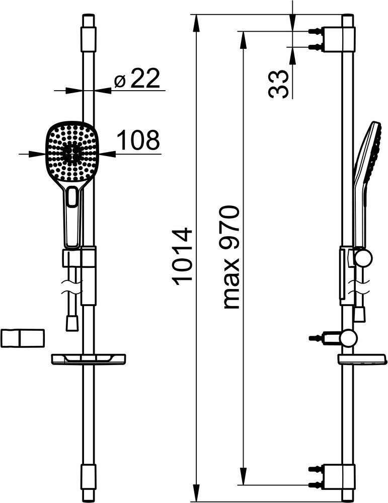 kürzbar, Heißwasserversorgung max. +65°C, Arbeitsdruck 0,5-5 bar, Durchfluss bei 3 bar (mit Regler) 15 l/min, Anschlussgröße G1/2, Durchmesser Ø 22 mm, Handbrausengröße 108 x 120 mm, Installationsabstand max 970 mm, Länge (mm) 1014 mm, Handbrause, Brausestange, verstellbare Brausestangehalterung, Seifenschale, Brausehalter, Brauseschlauch (1750 mm), Anti-Kalk-Technik, Twist guard, Verdrehschutz für Brauseschlauch