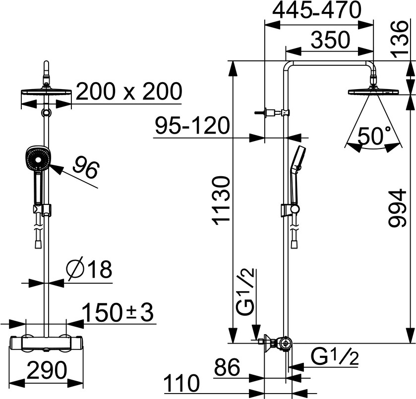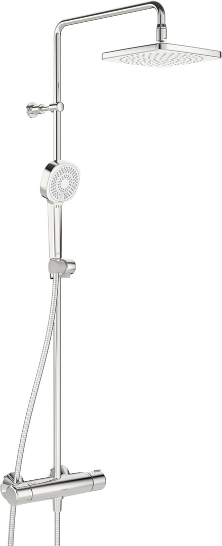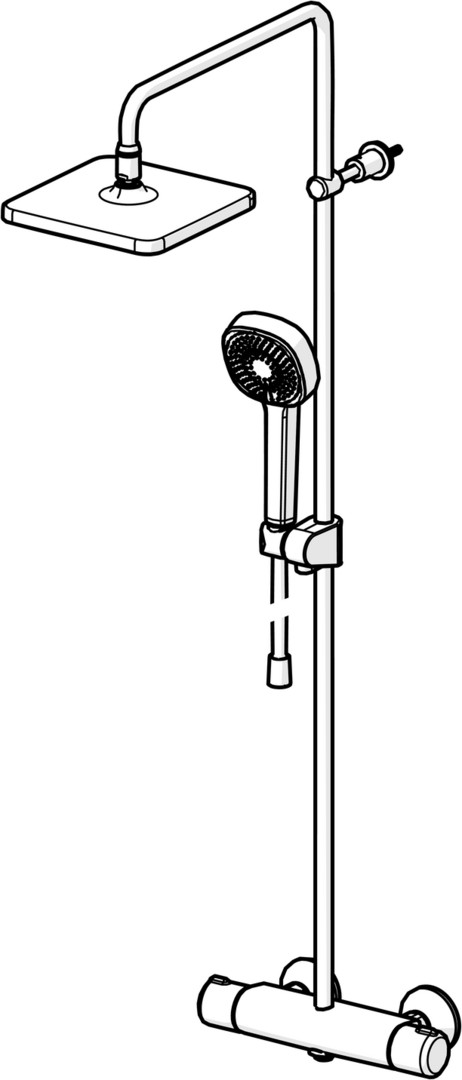 DN 15, Heißwasserversorgung max. 65°C, Arbeitsdruck 1-10 bar, Durchfluss bei 3 bar 18 / 15,6 l/min, Anschlussgröße G1/2, Kopfbrausengröße 200 x 200 mm, Handbrausengröße Ø 95 mm, Ausladung 445-470 mm, Installationsabstand 150 ± 3 mm, Sicherungseinrichtung (EN1717) EB, Geräuschklasse I (ISO 3822), Material Messing, Handbrause, Brausestange, Kopfbrause, verstellbare Brausestangehalterung, Brauseschlauch (1750 mm), Eco-Durchfuss, variable Montagemöglichkeit, schwenkbares Kugelgelenk, Anti-Kalk-Technik, S-Anschlüsse, Außengewinde, Abdeckung(en), Schalldämpfer, Oberteil mit keramischen Dichtscheiben zur Wassermengeneinstellung für einen Abgang, Thermostatkartusche zur Temperaturreglung, Rückfussverhinderer, Schmutzflter, Drehumsteller, druckunabhängig, integrierter Umsteller mit Absperrung, Sicherheitssperre gegen Verbrühen bei 38°C, mehr Sicherheit durch minimales Erwärmen des Armaturengehäuses, Temperatureinstellgriff, Durchfusseinstellgriff, Eco-Funktion für die Wassermenge, Sicherheitshebel, 3-strahlig, kürzbar