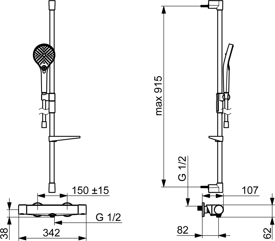 Heißwasserversorgung max. 65°C, Arbeitsdruck 1-10 bar, Durchfluss bei 3 bar (mit Regler) 7,8 l/min, Anschlussgröße G3/4, Handbrausengröße Ø 110 mm, Installationsabstand 150 ± 15 mm, Sicherungseinrichtung (EN1717) EB, Geräuschklasse I (ISO 3822), Material Messing/Verbundwerkstoff, Eco-Durchfluss, Handbrause, abnehmbare Ablage mit magnetischer Befestigung, verstellbare Brausestangehalterung, Brauseschlauch (1750 mm), Brausestange, Anti-Kalk-Technik, Seifenschale, Twist guard, Verdrehschutz für Brauseschlauch, variable Montagemöglichkeit, 3-strahlig, Oberteil mit keramischen Dichtscheiben zur Wassermengeneinstellung für einen Abgang, Thermostatkartusche zur Temperaturreglung, Rückfussverhinderer, Schmutzflter Drehumsteller, druckunabhängig, integrierter Umsteller mit Absperrung, Umstellung im Auslauf integriert, kürzbar, Schlauchdurchführung, drehbar, Temperatureinstellgriff, Durchfusseinstellgriff, Hebel mit W+K-Kennzeichnung, Easy-Grip Bedienhebel, Eco-Funktion für die Wassermenge, Sicherheitssperre gegen Verbrühen bei 38°C, mehr Sicherheit durch minimales Erwärmen des Armaturengehäuses, S-Anschlüsse, Abdeckung(en), Schalldämpfer