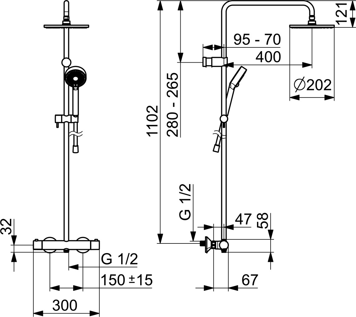 Durchflussmenge 12/13,8 l/min, gemessen bei 3 bar Fließdruck, Heißwasserversorgung max. 80 °C, Armaturenkörper aus entzinkungsbeständigem Messing (DZR), Kopfbrause Ø 202 mm, integrierter Umsteller mit Absperrung, Handbrause Ø 95 mm, Brausestange, Kopfbrause, verstellbare Brausestangenhalterung, Brauseschlauch (1250 mm), Eco-Durchfluss, 3-strahlig, Temperatureinstellgriff, Durchflusseinstellgriff, Sicherheitssperre gegen Verbrühen bei 38 °C, THERMO COOL minimales Erwärmen des Armaturengehäuses, S-Anschlüsse, Abdeckung, Schalldämpfer, (G 1/2), Oberteil mit keramische Dichtscheiben zur Wassermengeneinstellung für einen Abgang, Thermostatkartusche zur Temperaturreglung, Rückflussverhinderer, Schmutzfilter
