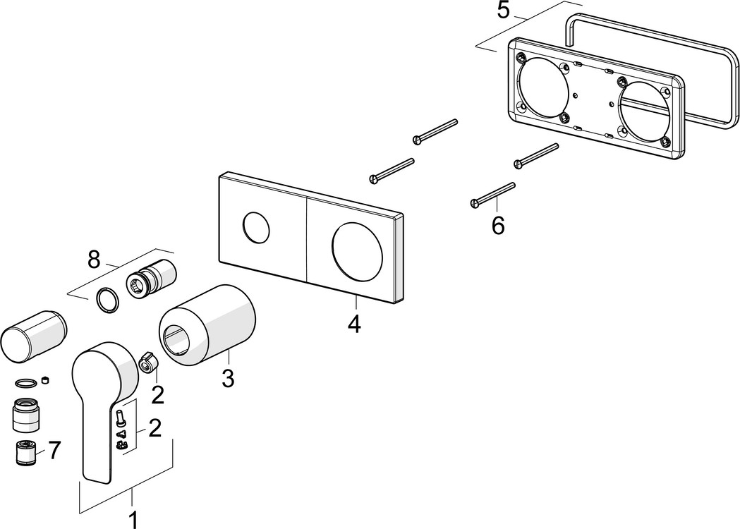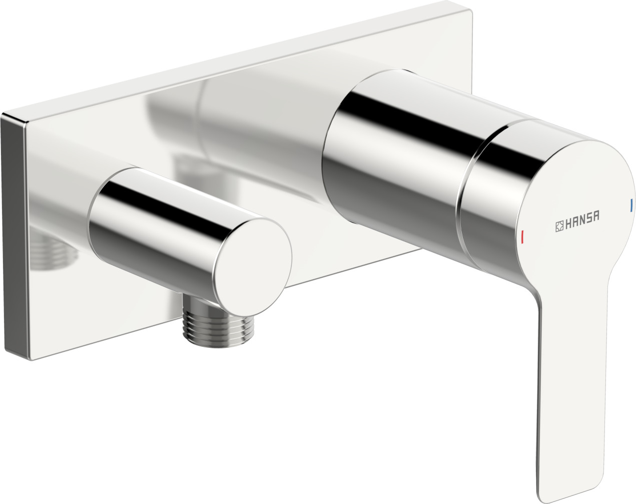 Heißwasserversorgung max. 90 °C, Wandanschlussbogen, Hebel mit W+K-Kennzeichnung, 4 mm Steuerpatrone mit keramischen Dichtscheiben zur Wassermengen- und Temperatureinstellung, Rückflussverhinderer, schraubenlose, eckige Rosette, Hülse