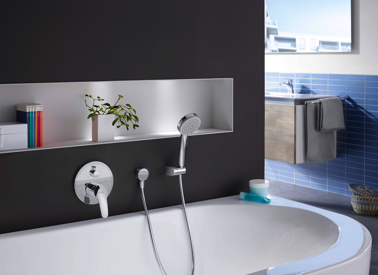 passend zu HANSABLUEBOX Einbaukörper, Heißwasserversorgung max. +80°C, Arbeitsdruck 0,5-10 bar, Spar-Durchfluss bei 3 bar 12,6 l/min, Durchfluss bei 3 bar 23,4 / 23,4 l/min, Sicherungseinrichtung (EN1717) HD, Geräuschklasse I (ISO 3822), Material Messing, BLUECLICK zur einfachen, schraubenlosen Rosettenbefestigung, BLUETUNE Ausrichtung nach Einbau +/- 3,5°, Funktionseinheit, Befestigung der Funktionseinheit mit Schrauben, Rosette rund, mit Sicherungseinrichtung, Ø 4,8 classic Steuerpatrone mit keramischen Dichtscheiben zur Wassermengen und Temperatureinstellung, Rückfussverhinderer, Drehumsteller, druckunabhängig, Temperaturbegrenzer, Heißwassersperre einstellbar (im Lieferumfang enthalten), Armaturenkörper aus entzinkungsbeständigem Messing (DZR), Hebel mit W+K-Kennzeichnung, Einhandbedienhebel/Griff