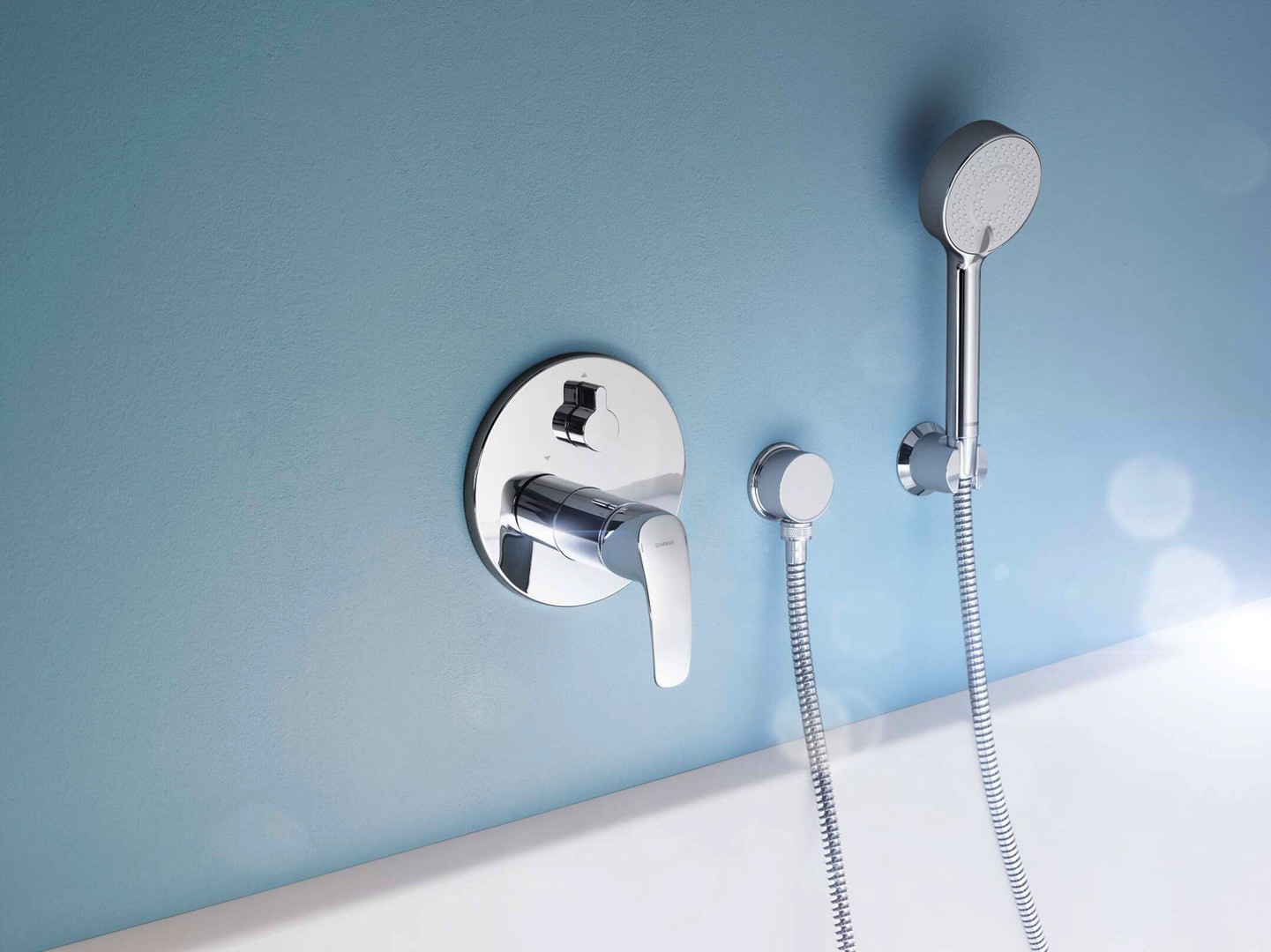 Wandmontage, passend zu HANSABLUEBOX Einbaukörper, Heißwasserversorgung max. 80°C, Arbeitsdruck 0,5-10 bar, Durchfluss bei 3 bar 20,4 / 20,4 l/min, Geräuschklasse I (ISO 3822), Material Messing, BLUECLICK zur einfachen, schraubenlosen Rosettenbefestigung, BLUETUNE Ausrichtung nach Einbau +/- 3,5°, Funktionseinheit, Befestigung der Funktionseinheit mit Schrauben, Rosette rund, Ø 4,0 Steuerpatrone mit keramischen Dichtscheiben zur Wassermengen- und Temperatureinstellung Hebel mit W+K-Kennzeichnung, Einhandbedienhebel/Griff, Temperaturbegrenzer, Heißwassersperre einstellbar (im Lieferumfang enthalten), Armaturenkörper aus entzinkungsbeständigem Messing (DZR), Drehumsteller, druckunabhängig