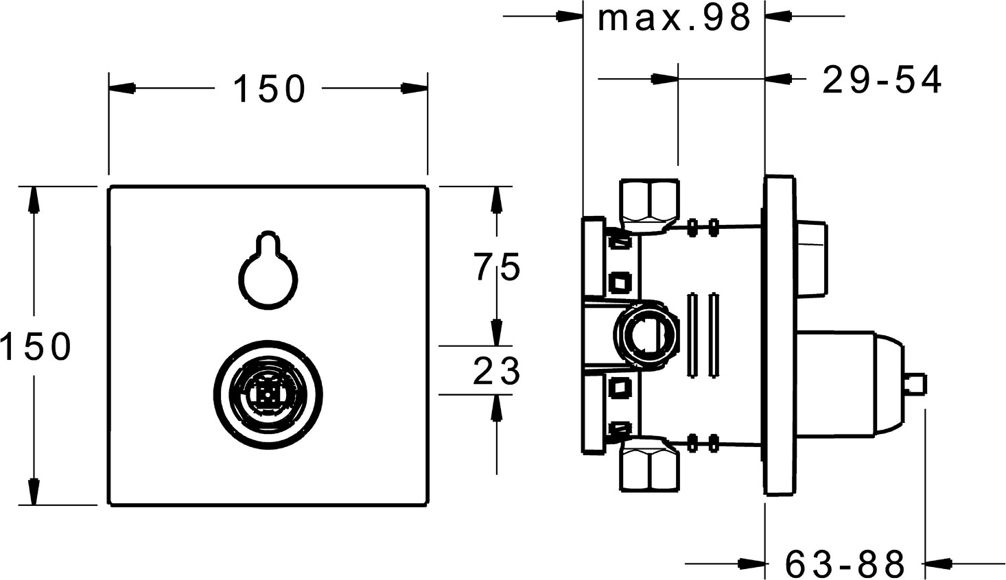 Heißwasserversorgung max. 80°C, Arbeitsdruck 0,5-10 bar, Durchfluss bei 3 bar 22,2 / 21 l/min, Material Messing, Ø 3,5 classic Steuerpatrone mit keramischen Dichtscheiben zur Wassermengen- und Temperatureinstellung, Funktionseinheit, Befestigung der Funktionseinheit mit Schrauben, Rosette eckig, ohne Bedienhebel, Temperaturbegrenzer, Heißwassersperre einstellbar (im Lieferumfang enthalten), Drehumsteller, druckunabhängig
