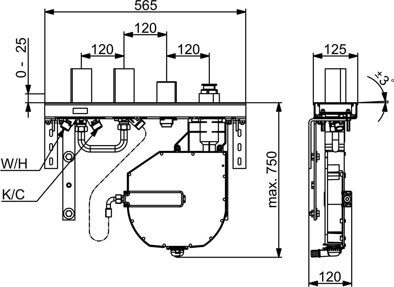 DN 20, Heißwasserversorgung max. 70°C, Arbeitsdruck 0,5-10 bar, Anschlussgröße G3/4, Sicherungseinrichtung (EN1717) EB, Material Messing, eigensicher gegen Rückfießen im häuslichen Gebrauch (nach DIN EN 1717), Leckwasserablauf in Rollbox mit Rückstausicherung Drehumsteller, druckunabhängig, Ø 4,0 Steuerpatrone mit keramischen Dichtscheiben zur Wassermengen- und Temperatureinstellung, Anschluss über fexible Druckschläuche Temperaturbegrenzer, Heißwassersperre einstellbar (im Lieferumfang enthalten), ROLLBOX mit automatischer Schlauchrückführung
