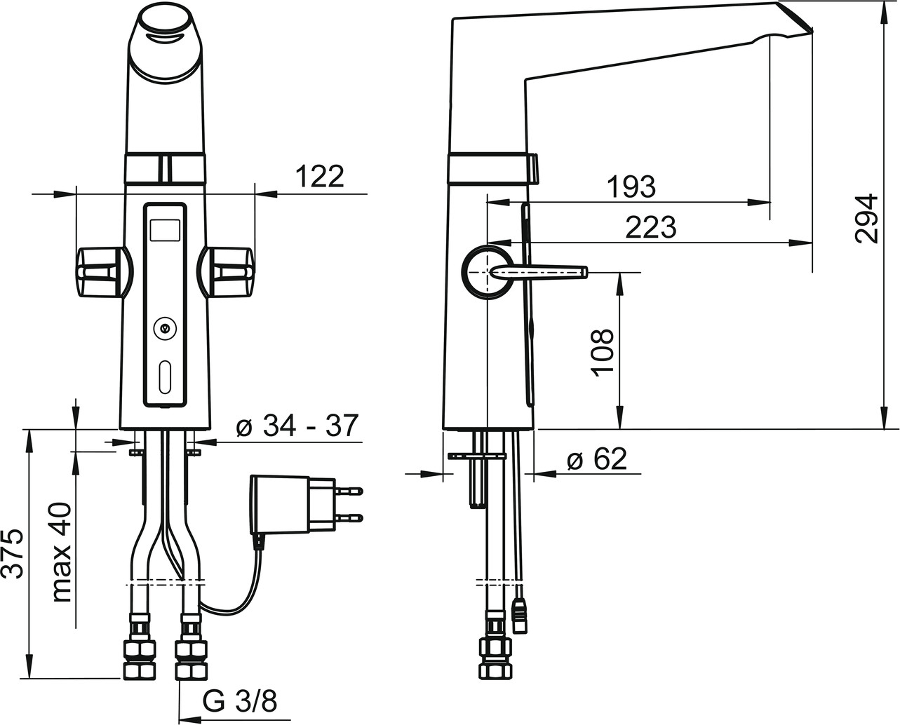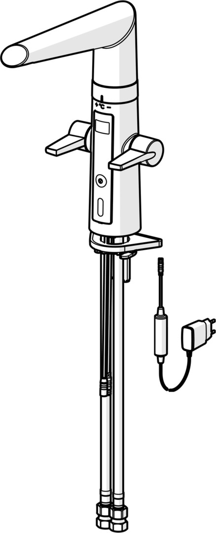 DN 15, Durchflussmenge 12 l/min, gemessen bei 3 bar Fließdruck, Heißwasserversorgung max. 70 °C, Armaturenkörper aus entzinkungsbeständigem Messing (DZR), Messing in Trinkwasserkontakt enthält weniger als 0,3 % Blei, Wasserwege ohne Nickelbeschichtung, Einstellung per Tasten veränderbar, Zweihandbedienhebel/Griffe, Anschluss über flexible Druckschläuche G 3/8, Oberteil mit keramischen Dichtscheiben zur Wassermengeneinstellung für einen Abgang, Mischventil zur manuellen Temperatureinstellung, Schmutzfilter, PSD-Sensor mit Autofocus, Magnetventil, Kontrolleinheit, mit Netzteil, Signalleuchten, automatische Hygienespülung, Schwenkbereich des Auslaufs 120° (80°/60°), Anschlag herausnehmbar, Cascade-Strahlregler, Cache Strahlregler ohne Mundstück direkt in den Armaturenauslauf geschraubt, max. Fließdauer 40 s, Betriebsspannung 5 V