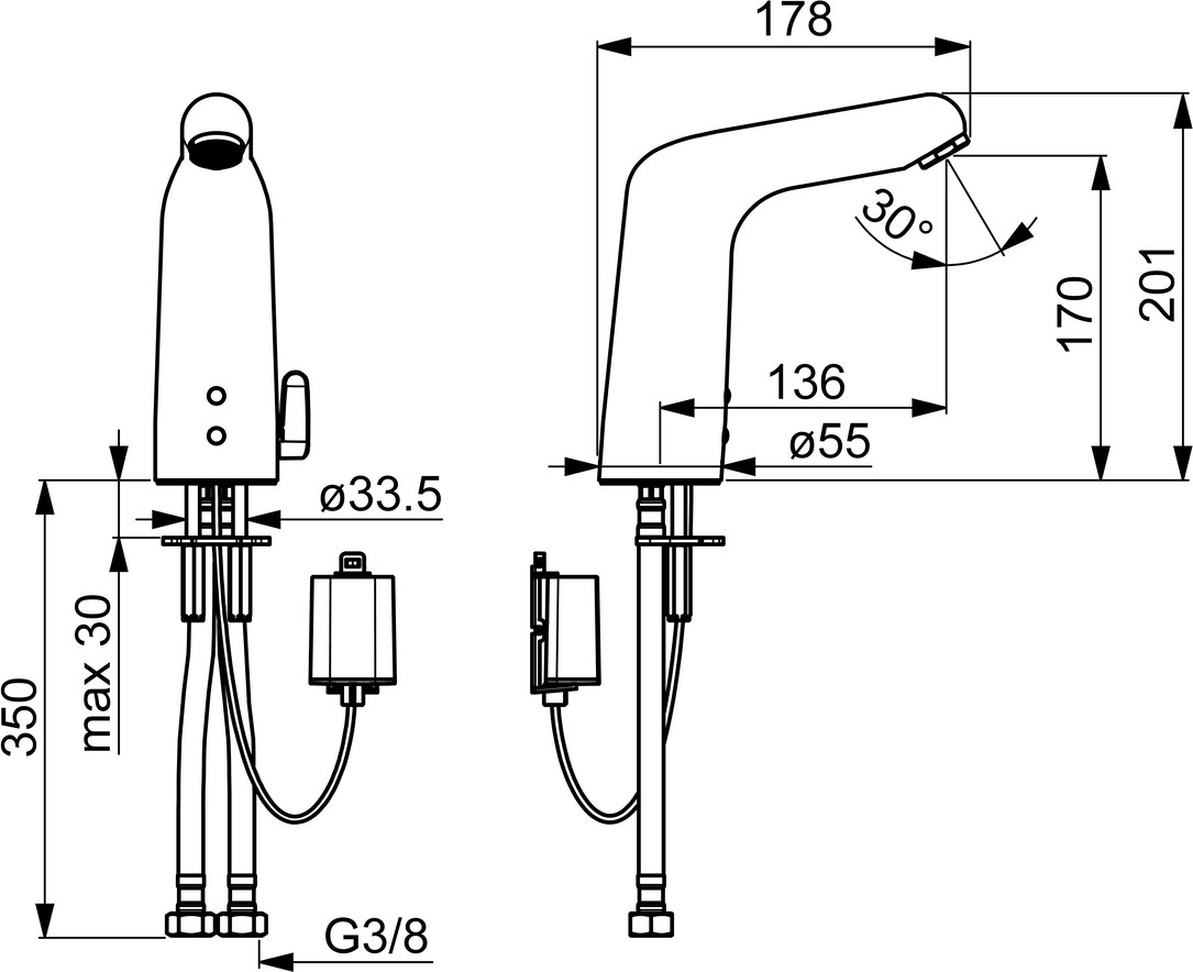 berührungslos, Batteriebetrieb, Bluetooth fähig, Standmontage (1-Loch), DN15, Heißwasserversorgung: max. +70°C, Arbeitsdruck: 1 - 10 bar, Durchfluss bei 3 bar (mit Regler): 6 l/min, Anschlussgröße G 3/8", Ausladung 136 mm, Arbeitsspannung 6 V, Sicherungseinrichtung (EN1717) AA, Geräuschklasse I (ISO 3822), Schutzklasse IP 55, Batterie Lithium 2CR5 6 V, Bluetooth version 4.x (D034445), Material aus Messing, Armaturenkörper aus entzinkungsbeständigem Messing (DZR), Messing in Trinkwasserkontakt enthält weniger als 0,3% Blei, Wasserwege ohne Nickelbeschichtung, für kurze Zeitspannen thermisch desinfizierbar, Softwaresettings per App änderbar, Anschluss über flexible Druckschläuche, Spezialbeschichtung für hygienische Anforderungen, Heißwassersperre einstellbar (im Lieferumfang enthalten), ohne Ablaufgarnitur, ohne Zugstangenbohrung, Temperatureinstellgriff, Schmutzfilter, Mischventil zur manuellen Temperatureinstellung, Rückflussverhinderer, PSD-Sensor mit Autofocus, Magnetventil, Batterie-Leer-Anzeige feststehender Auslauf, gegossen, kristallklarer Laminarstrahl