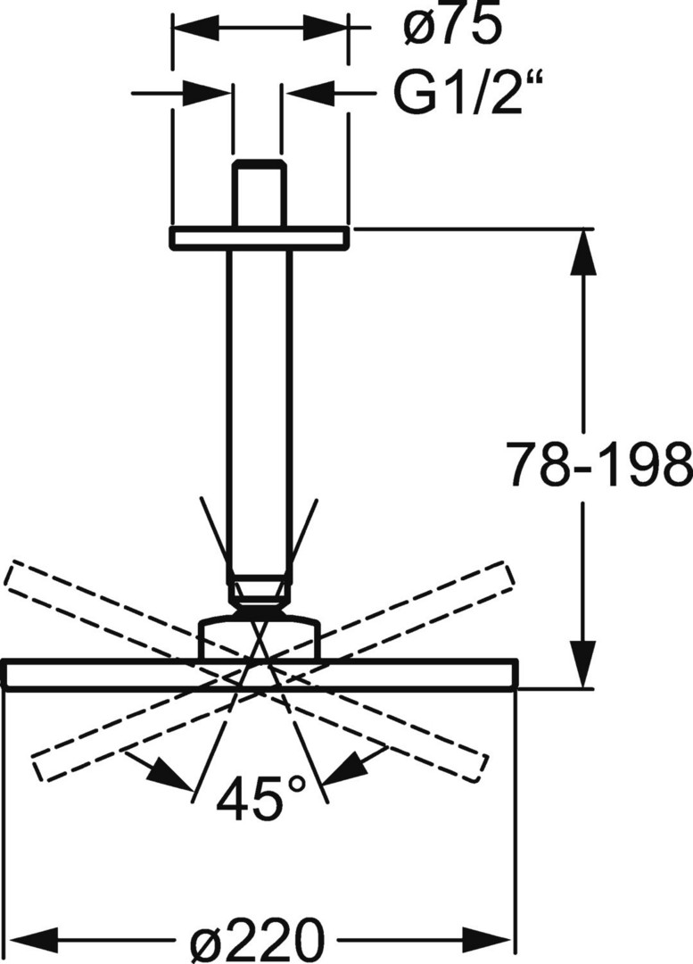 DN 15, Durchflussmenge 12 l/min, gemessen bei 3 bar Fließdruck, Heißwasserversorgung max. 65 °C, Anti-Kalk-Technik, verstärkte Ausführung, kürzbar, Kopfbrause Ø 220 mm, Eco-Durchfluss, 1-strahlig, Außengewinde Abdeckung G1/2