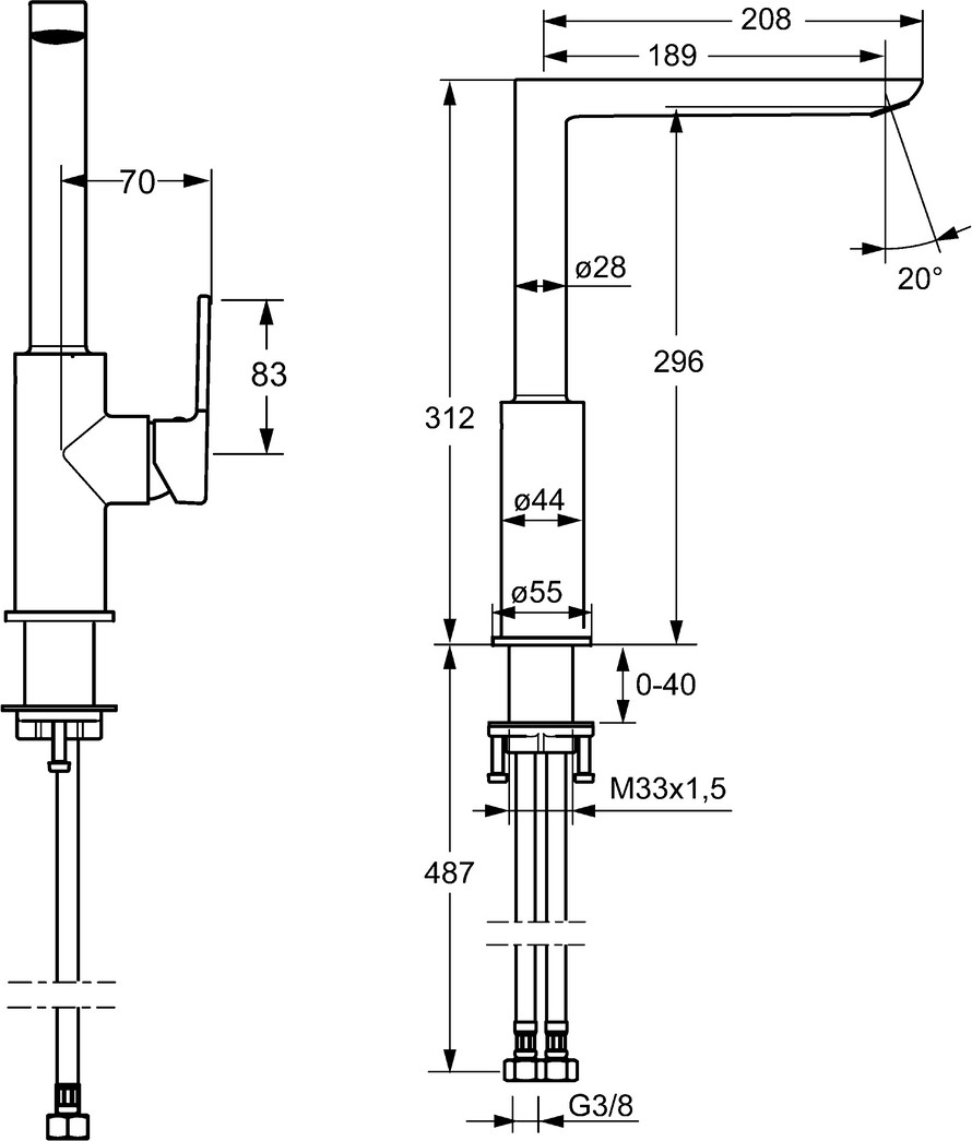 DN 15, Durchflussmenge 9 l/min, gemessen bei 3 bar Fließdruck, Heißwasserversorgung max. 80 °C, Armaturenkörper aus entzinkungsbeständigem Messing (DZR), Durchflusseinstellgriff, Hebel mit W+K-Kennzeichnung, Anschluss über flexible Druckschläuche G 3/8, Ø 2,5 Steuerpatrone mit keramischen Dichtscheiben zur Wassermengen- und Temperatureinstellung, Schwenkbereich des Auslaufs 150°, Cascade-Strahlregler