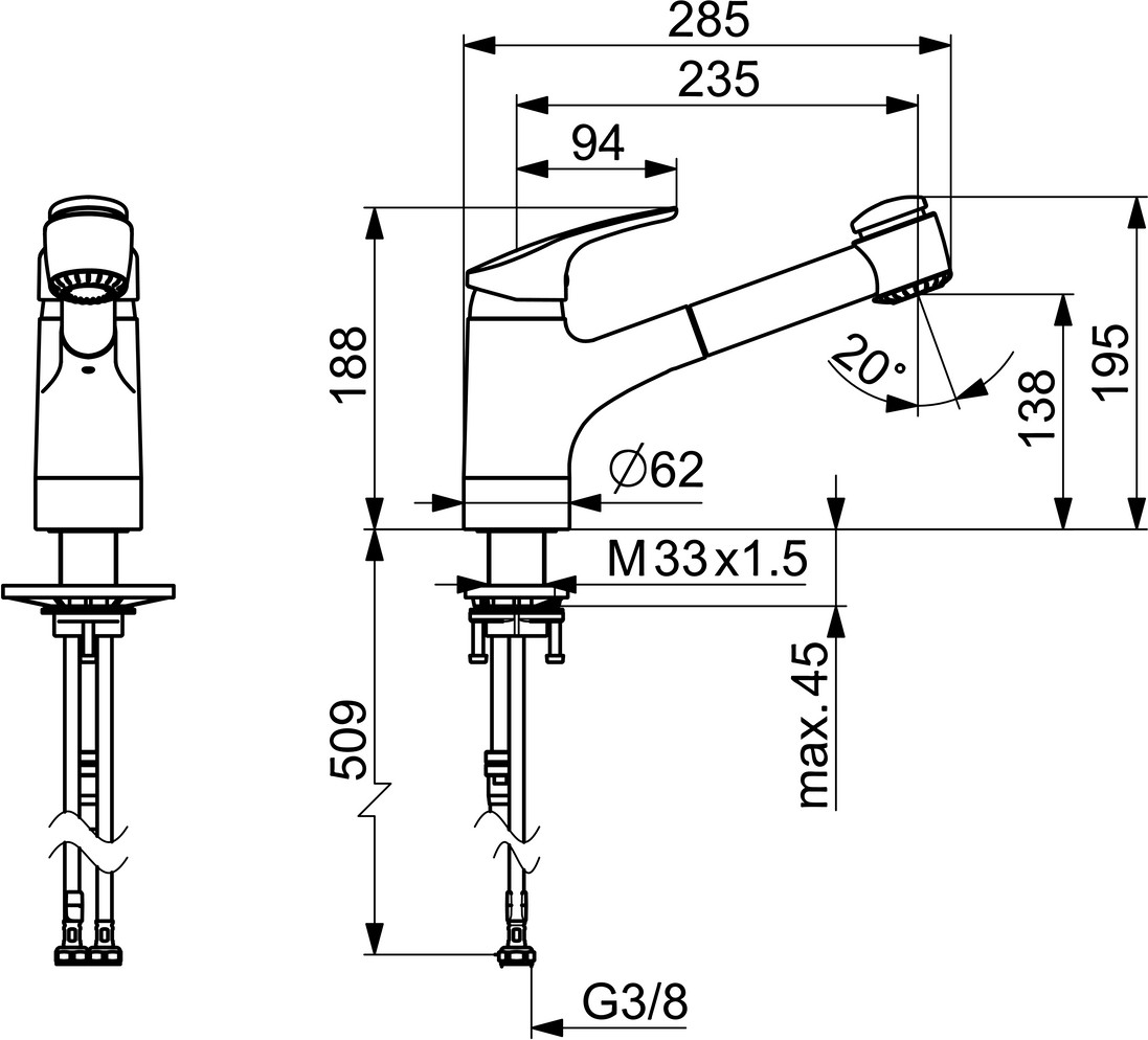 HANSA Spültisch-Einhebelmischer HANSAMIX Ausziehbrause, schwenkbar, 2-strahlig, Ausladung 235 mm, chrom