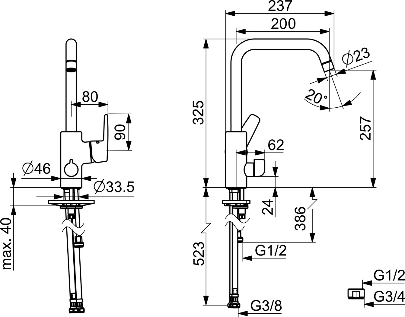DN 15, Durchflussmenge 12 l/min, gemessen bei 3 bar Fließdruck, Heißwasserversorgung max. 80 °C, Armaturenkörper aus entzinkungsbeständigem Messing (DZR), Rapid-Montagesystem, Hebel mit W+K-Kennzeichnung, Temperaturbegrenzer, Heißwassersperre einstellbar, Anschluss über flexible Druckschläuche G 3/8, Ø 3.5 classic Steuerpatrone mit keramischen Dichtscheiben zur Wassermengen- und Temperatureinstellung, Schwenkbereich des Auslaufs 120° (60°/0°), Anschlag herausnehmbar, Cascade-Strahlregler