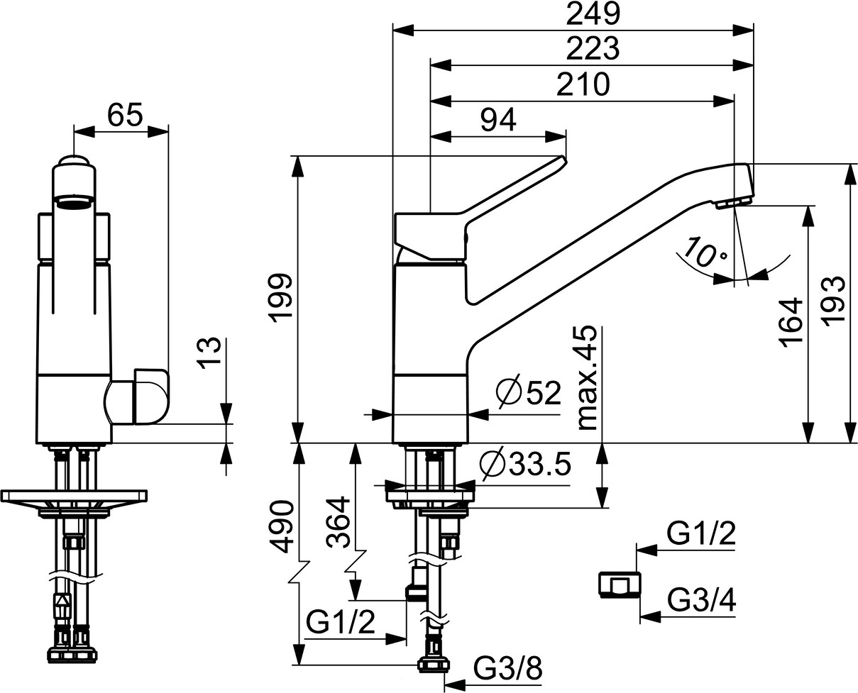 DN 15, Durchflussmenge 12 l/min, gemessen bei 3 bar Fließdruck, Heißwasserversorgung max. 80 °C, Armaturenkörper aus entzinkungsbeständigem Messing (DZR), Rapid-Montagesystem, Hebel mit W+K-Kennzeichnung, Temperaturbegrenzer, Heißwassersperre einstellbar, Anschluss über flexible Druckschläuche G 3/8, Ø 3.5 classic Steuerpatrone mit keramischen Dichtscheiben zur Wassermengen- und Temperatureinstellung, Schwenkbereich des Auslaufs 120°, Cascade-Strahlregler