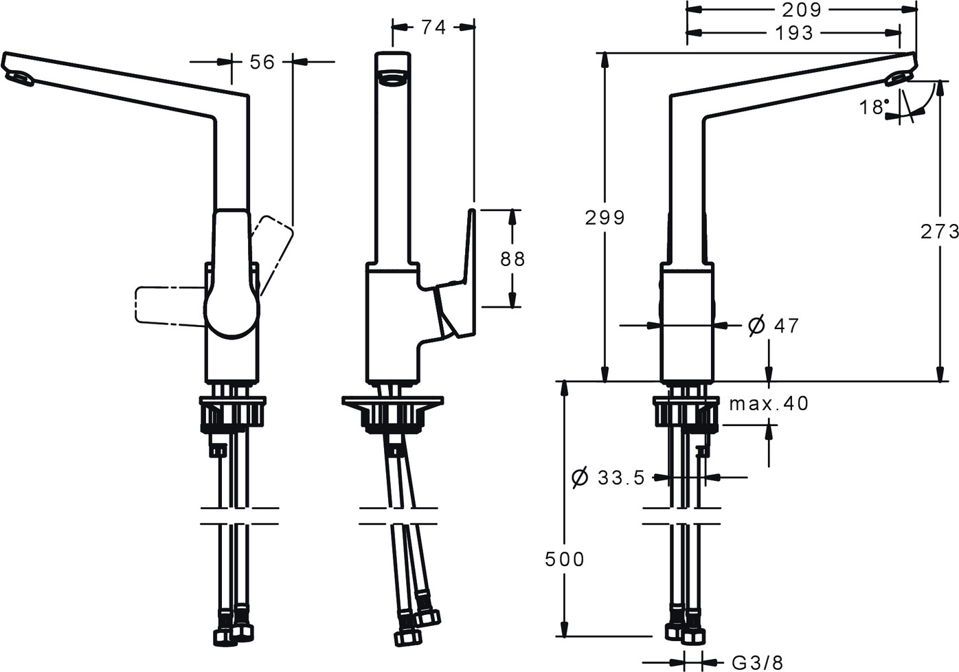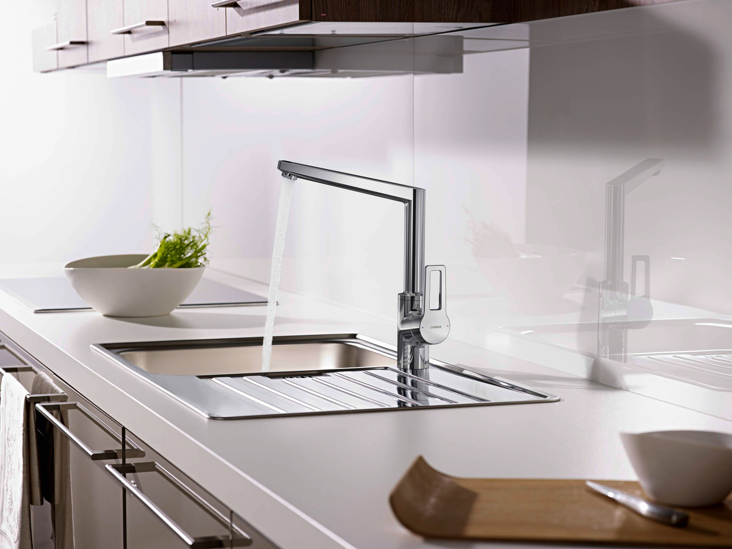 DN 15, Durchflussmenge 12 l/min, gemessen bei 3 bar Fließdruck, Heißwasserversorgung max. 80 °C, Armaturenkörper aus entzinkungsbeständigem Messing (DZR), Messing in Trinkwasserkontakt enthält weniger als 0,3 % Blei, Wasserwege ohne Nickelbeschichtung, Hebel mit W+K-Kennzeichnung, Temperaturbegrenzer, Heißwassersperre einstellbar, Anschluss über flexible Druckschläuche G 3/8, Ø 3.5 classic Steuerpatronen mit keramischen Dichtscheiben zur Wassermengen- und Temperatureinstellung, Schwenkbereich des Auslaufs 150° (360°), gegossen, Cascade-Strahlregler