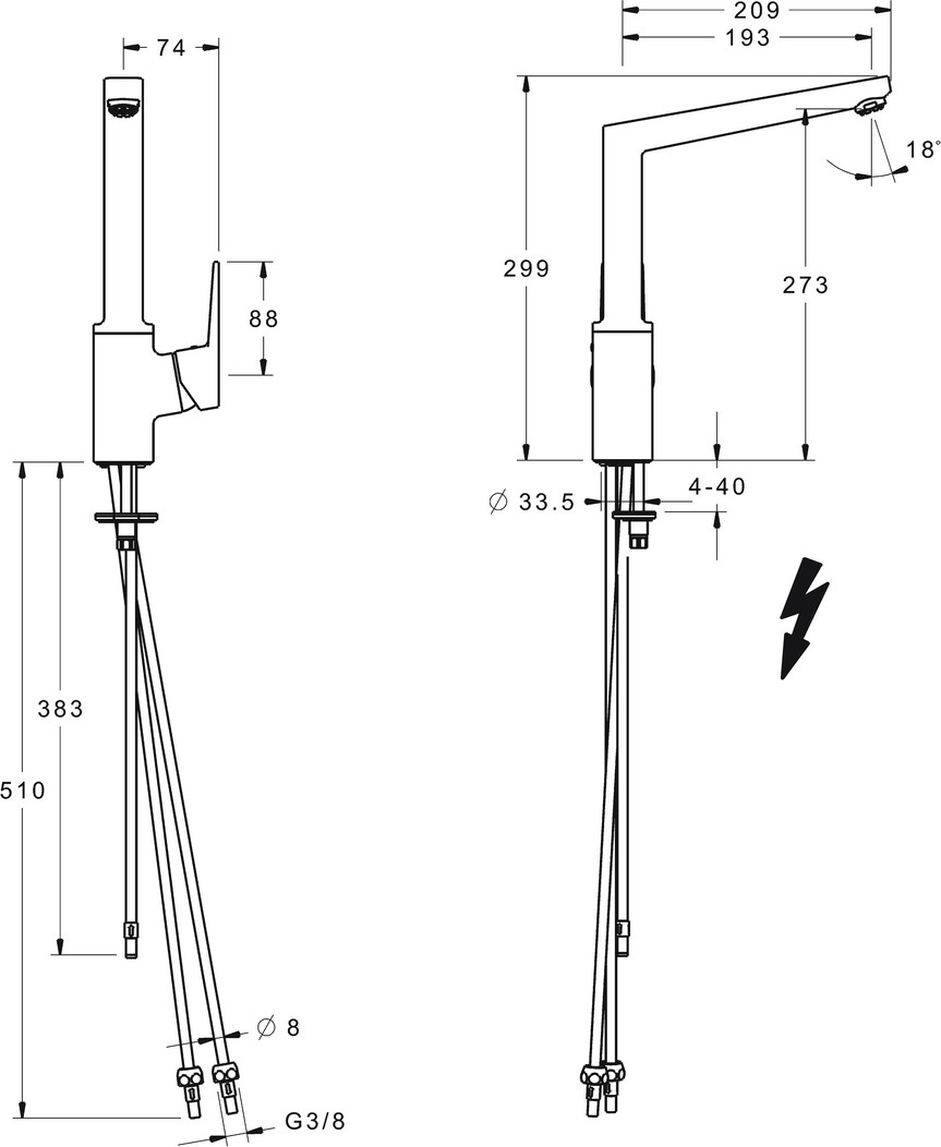 DN 15, Heißwasserversorgung max. 80 °C, Armaturenkörper aus entzinkungsbeständigem Messing (DZR), Messing in Trinkwasserkontakt enthält weniger als 0,3 % Blei, Wasserwege ohne Nickelbeschichtung, Hebel mit W+K-Kennzeichnung, Temperaturbegrenzer, Heißwassersperre einstellbar, Anschluss über Kupferrohre, Ø 3.5 classic Steuerpatronen mit keramischen Dichtscheiben zur Wassermengen- und Temperatureinstellung, Schwenkbereich des Auslaufs 150°, gegossen, Cascade-Strahlregler, kristallklarer Laminarstrahl