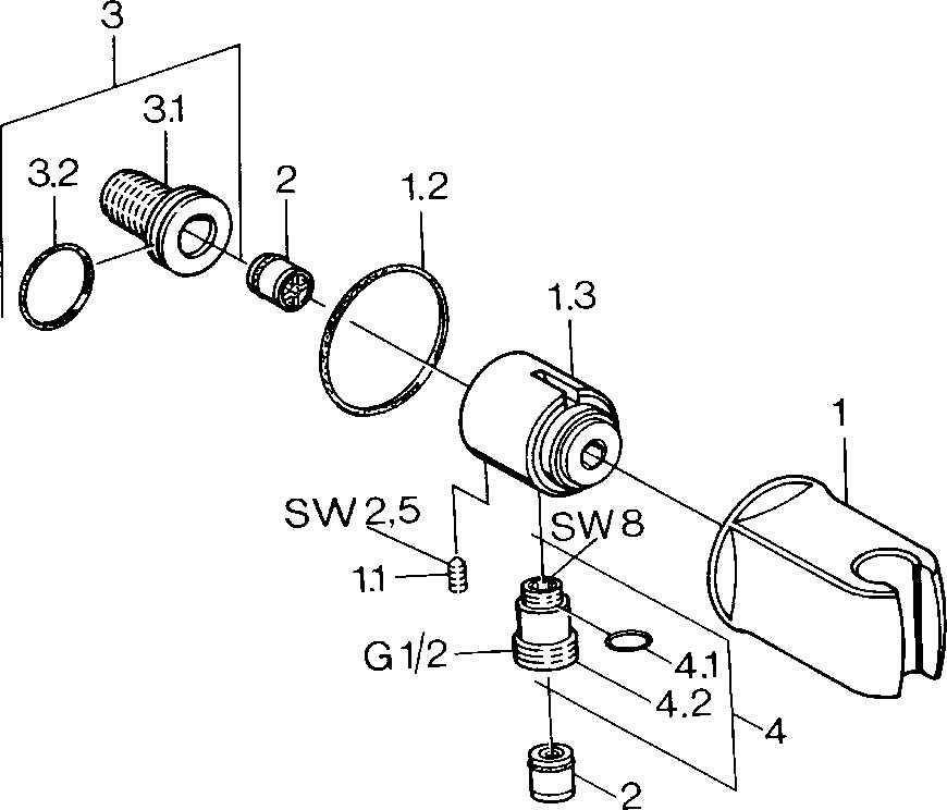 DN 15, Heißwasserversorgung max. 80°C, Arbeitsdruck 0,5-10 bar, Anschlussgröße G1/2, Sicherungseinrichtung (EN1717) EB, Material Messing, eigensicher gegen Rückfießen im häuslichen Gebrauch (nach DIN EN 1717), zweiteilige Bauweise, Wandanschlussbogen, Brausehalter, Kugelkopf-S-Anschlüsse, Rückfussverhinderer