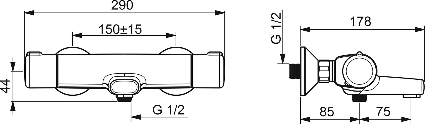 DN 15, Heißwasserversorgung max. 80°C, Arbeitsdruck 1-10 bar, Spar-Durchfluss bei 3 bar 9,6 l/min, Durchfluss bei 3 bar 20,4 / 19,2 l/min, Anschlussgröße G1/2, Ausladung 159 mm, Installationsabstand 150 ± 15 mm, Sicherungseinrichtung (EN1717) EB, Geräuschklasse II (ISO 3822), Material Messing/Verbundwerkstoff, Thermostatkartusche zur Temperaturreglung, Schmutzflter, Oberteil mit keramischen Dichtscheiben zur Wassermengeneinstellung für einen Abgang, Armaturenkörper aus entzinkungsbeständigem Messing (DZR), S-Anschlüsse, mehr Sicherheit durch minimales Erwärmen des Armaturengehäuses, Sicherheitssperre gegen Verbrühen bei 38°C, Drehumsteller, druckunabhängig, integrierter Umsteller mit Absperrung, feststehender Auslauf, Temperatureinstellgriff, Durchfusseinstellgriff, Eco-Funktion für die Wassermenge, Sicherheitshebel, eigensicher gegen Rückfießen im häuslichen Gebrauch (nach DIN EN 1717), Strahlregler, Eco-Durchfuss