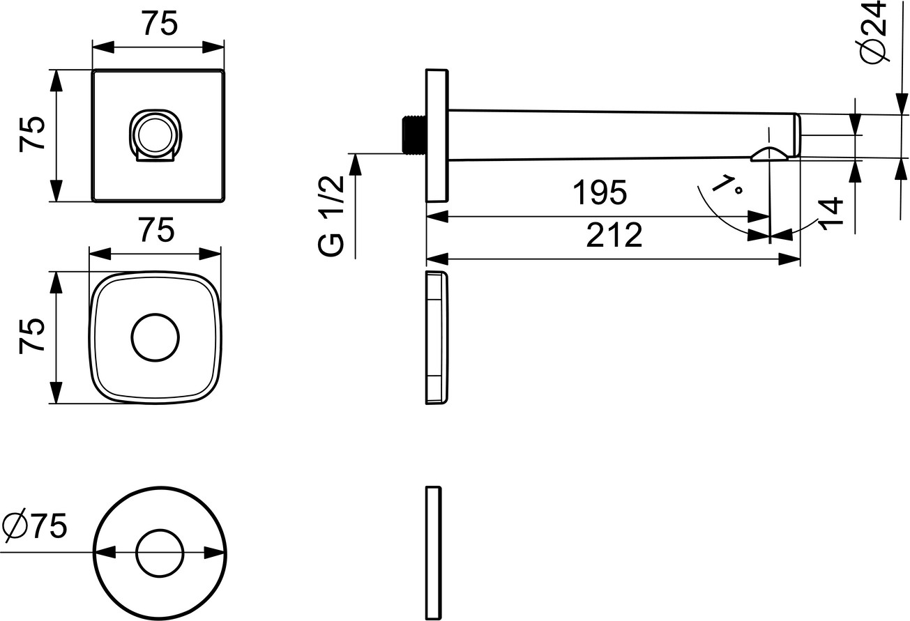 Heißwasserversorgung max. 80°C, Arbeitsdruck 0,5-10 bar, Durchfluss bei 3 bar 18 l/min, Anschlussgröße G1/2, Durchmesser 24,5 mm, Ausladung 195 mm, Länge (mm) 212 mm, Material Messing, integrierter Strahlregler, ohne Mundstück direkt in den Armaturenauslauf geschraubt, Kristallklarer Laminarstrahl, Armaturenkörper aus entzinkungsbeständigem Messing (DZR), Wanneneinlauf, Rosette eckig, Rosette rund, Rosette soft edge, feststehender Auslauf, gegossen