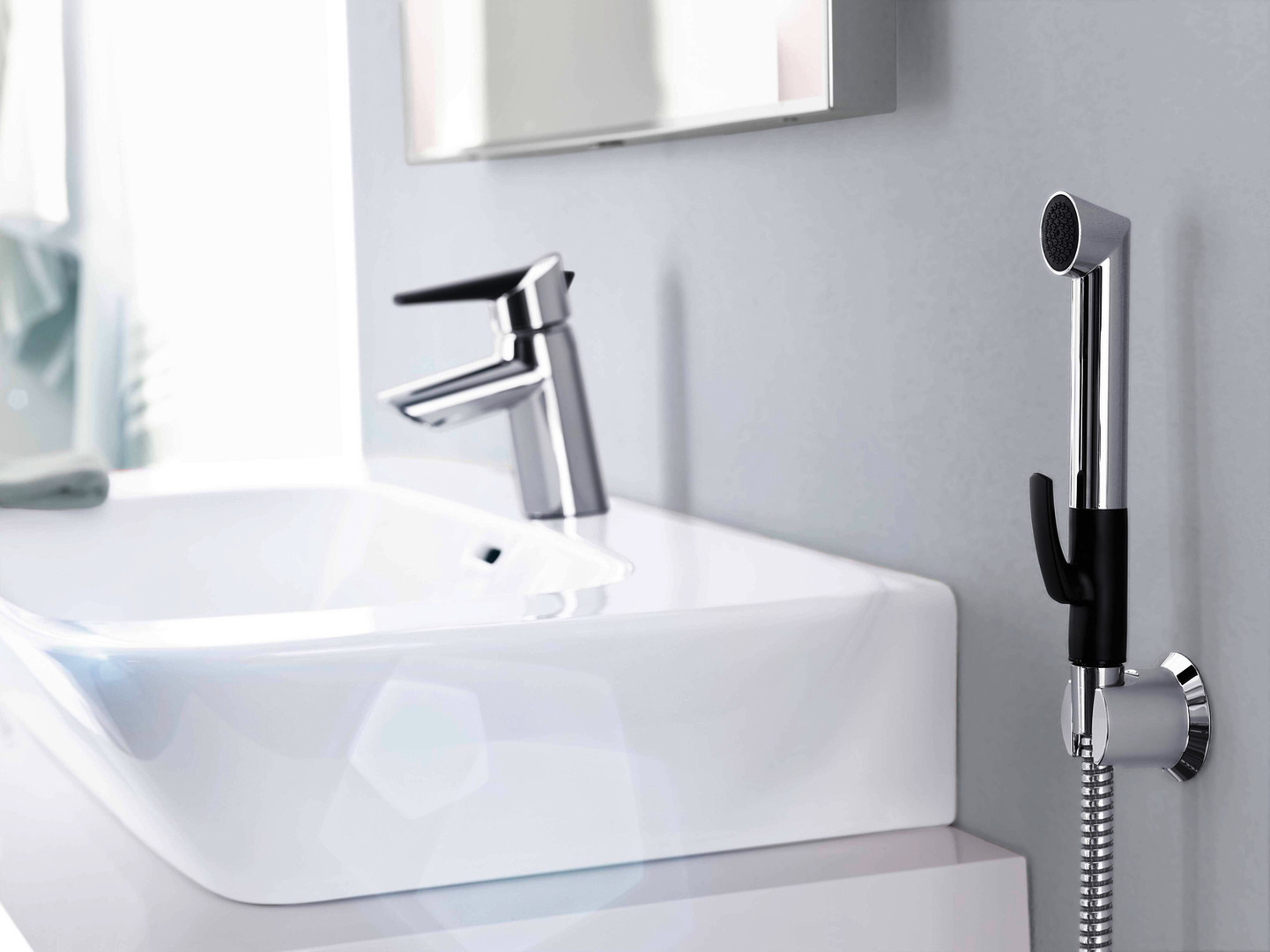 HANSA Waschtisch/Bidette-Einhebelmischer HANSAFIT mit Funktionshandbrause und Push-Open-Ablaufgarnitur, Ausladung 98mm, chrom