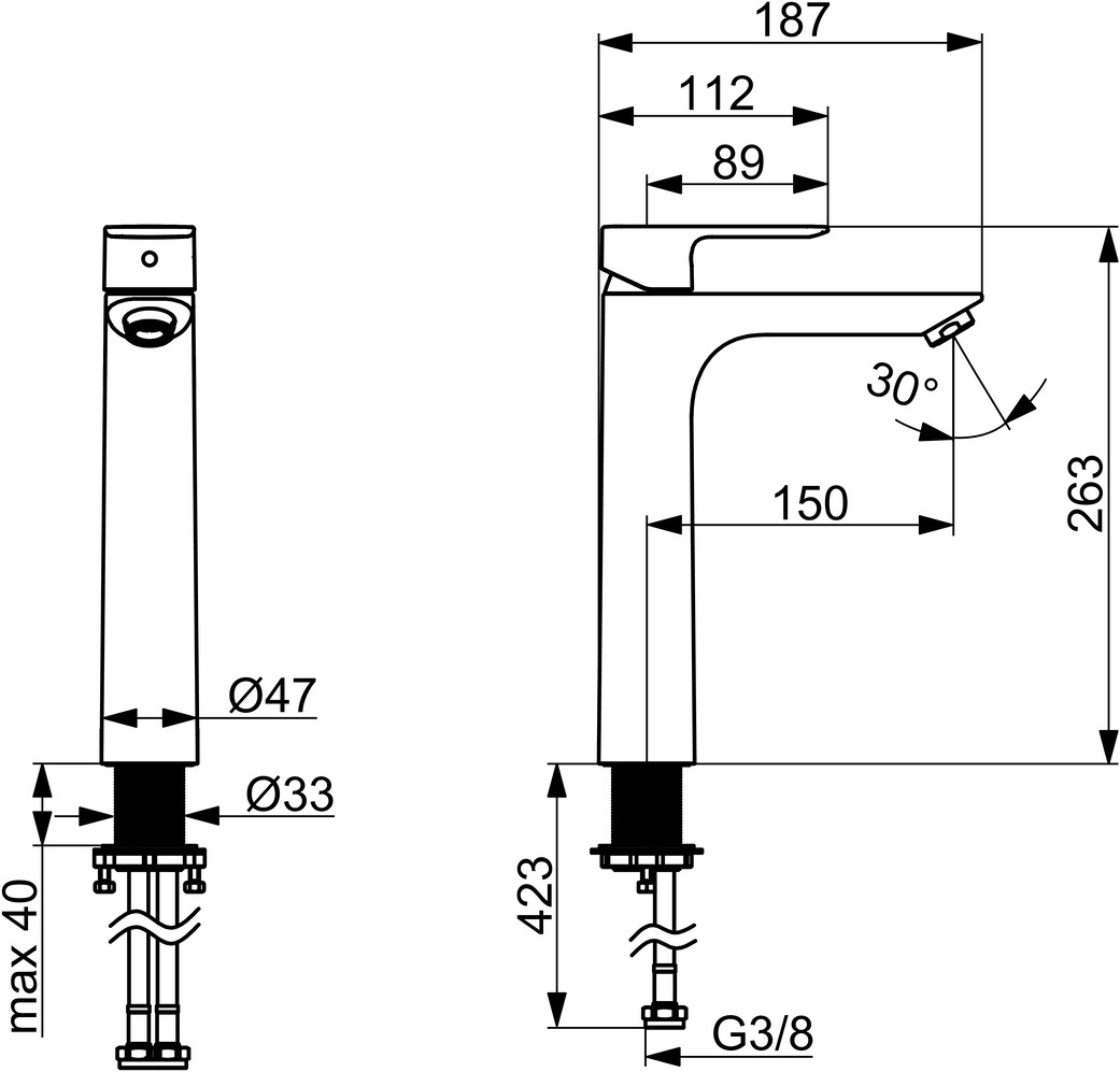 DN 15, Heißwasserversorgung max. 70°C, Arbeitsdruck 0,5-10 bar, Durchfluss bei 3 bar (mit Regler) 4,8 l/min, Anschlussgröße G3/8, Ausladung 150 mm, Sicherungseinrichtung (EN1717) AA, Geräuschklasse I (ISO 3822), Material Messing, Ø 3,5 classic Steuerpatrone mit keramischen Dichtscheiben zur Wassermengen- und Temperatureinstellung, konstante Durchfussleistung unabhängig vom Fließdruck, Anschluss über fexible Druckschläuche, Temperaturbegrenzer, Hebel mit W+K-Kennzeichnung, Einhandbedienhebel/Griff, ohne Zugstangenbohrung, feststehender Auslauf