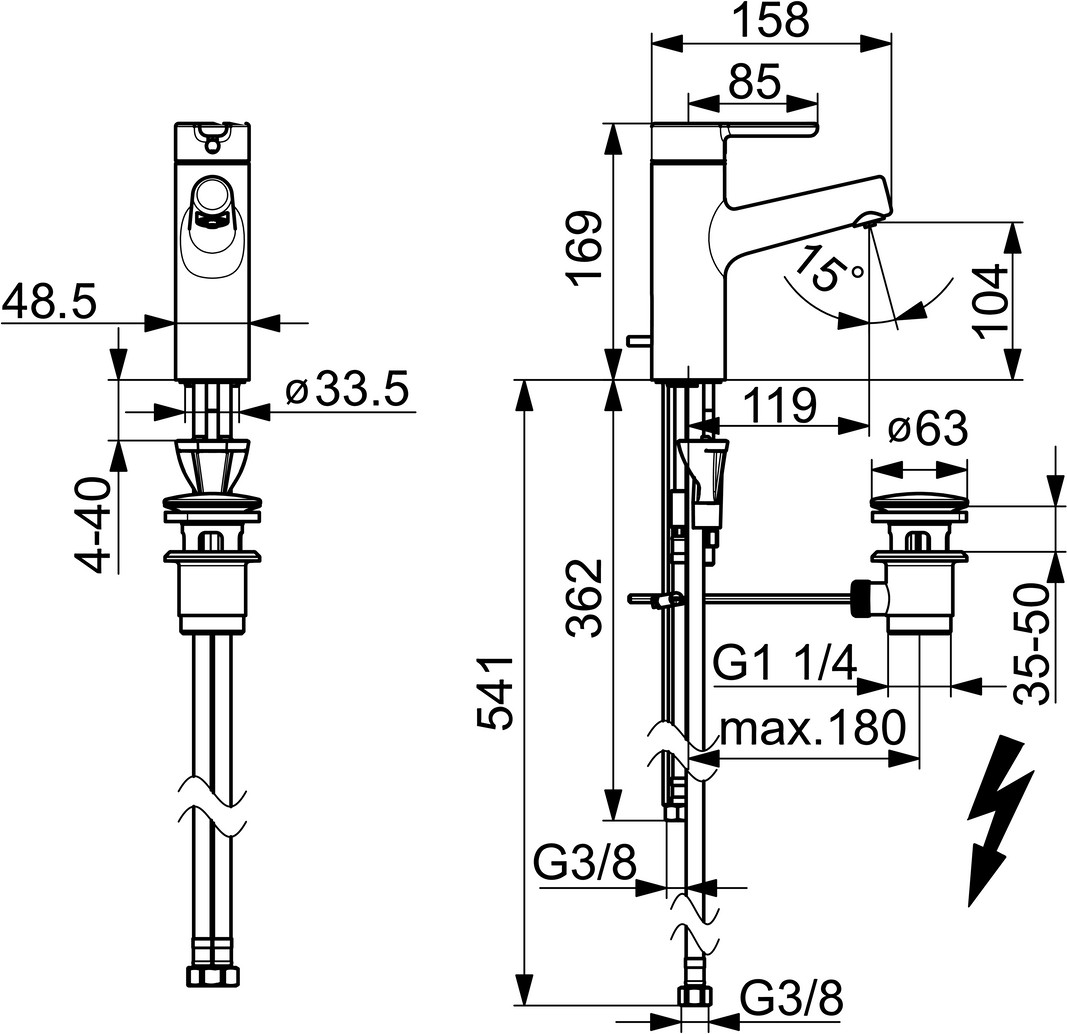 DN 15, Durchflussmenge 6 l/min, gemessen bei 3 bar Fließdruck, Heißwasserversorgung max. 80 °C, Armaturenkörper aus entzinkungsbeständigem Messing (DZR), 3S-Installations-System für sichere und schnelle Montage, Hebel mit W+K-Kennzeichnung, Anschluss über flexible Druckschläuche G 3/8, Ø 4 mm Steuerpatrone mit keramischen Dichtscheiben zur Wassermengen- und Temperatureinstellung, feststehender Auslauf, Cascade Strahlregler, mit kristallklarem Laminarstrahl