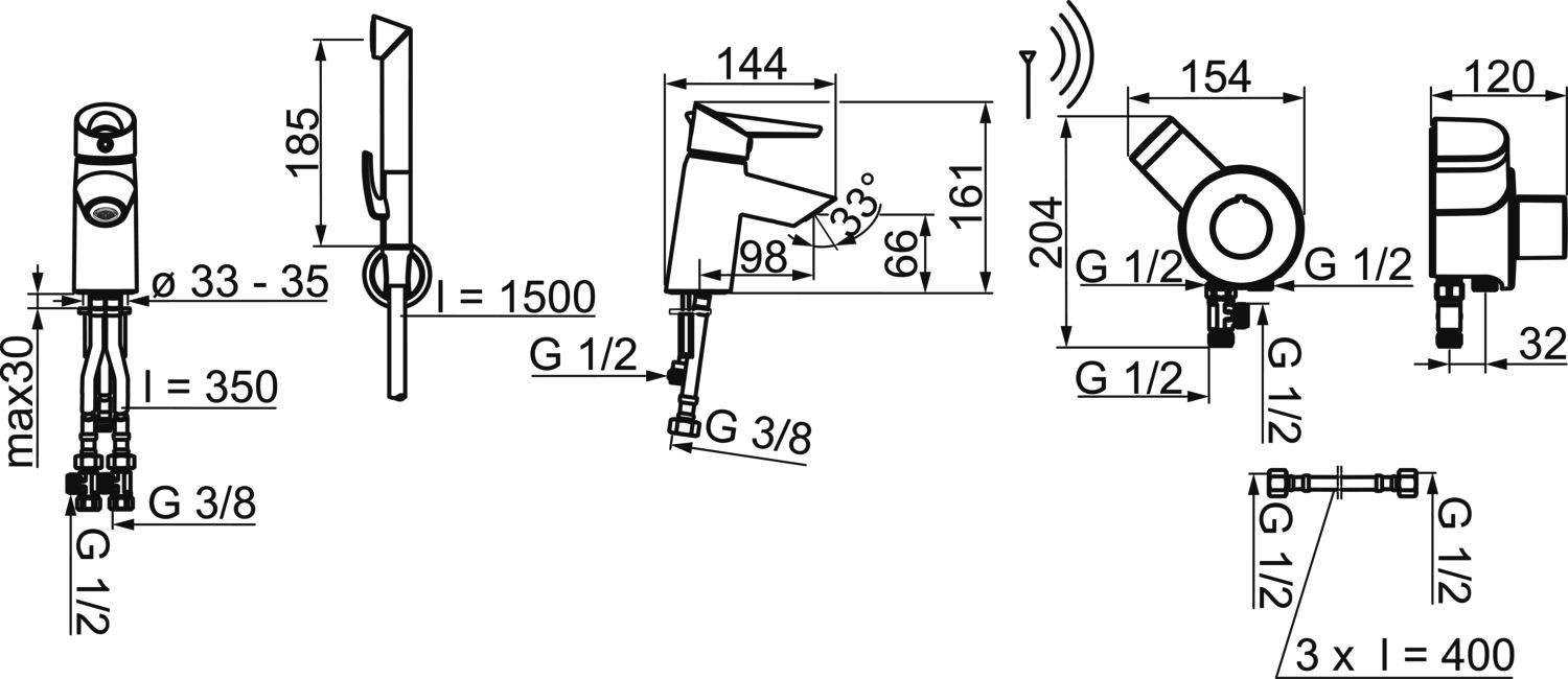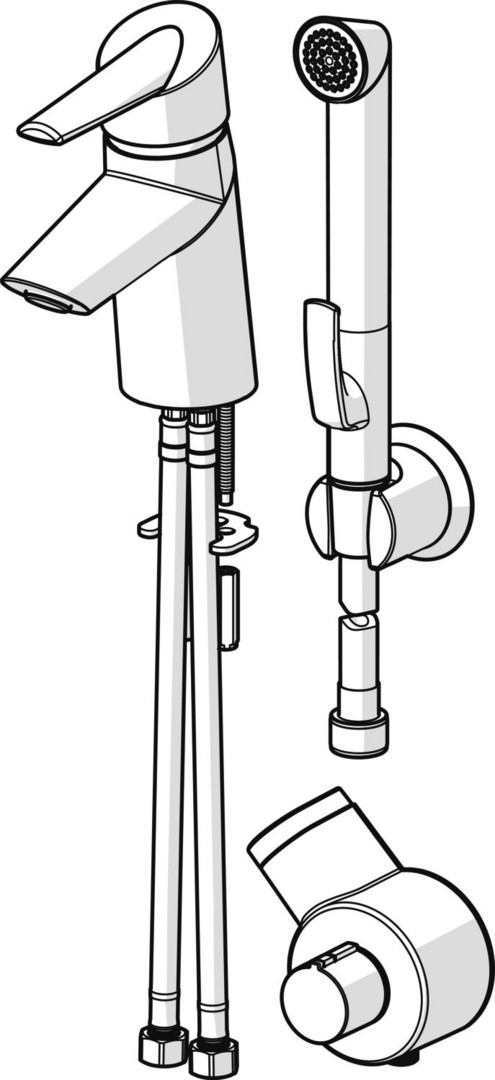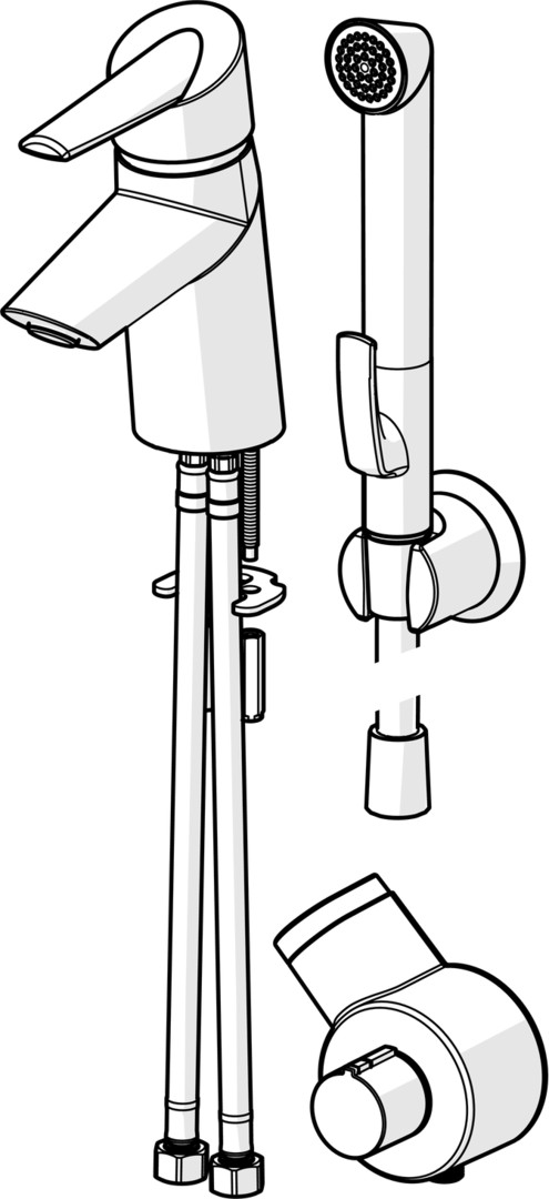 DN 15, Durchflussmenge 7,8 l/min, Spar-Durchflussmenge 6 l/min, gemessen bei 3 bar Fließdruck, Heißwasserversorgung max. 70 °C, mit fernbedienbarer Funktionsbrause, Brausehalter, Brauseschlauch (1500 mm), Temperatureinstellgriff, Easy-Grip Bedienhebel, Eco-Funktion für die Wassermenge, Hebel mit W+K-Kennzeichnung, Sicherheitssperre gegen Verbrühen bei 38 °C, Anschluss über flexible Druckschläuche, Thermostatkartusche zur Temperaturreglung, Rückflussverhinderer, Schmutzfilter, Kontrolleinheit, Batterie AA 1,5 V Lithium x 2, CR 2450 3 V, ohne Ablaufgarnitur und Zugstangenbohrung, feststehender Auslauf, Strahlregler mit verbessertem Kalkschutz, Cache-Strahlregler ohne Mundstück direkt in den Armaturenauslauf geschraubt, max. Fließdauer 2 min, Betriebsspannung 3 V