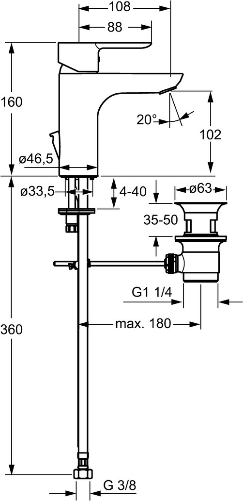 DN 15, Heißwasserversorgung max. 70°C, Arbeitsdruck 0,5-10 bar, Durchfluss bei 3 bar (mit Regler) 6 l/min, Anschlussgröße G3/8, Ausladung 108 mm, Sicherungseinrichtung (EN1717) AA, Geräuschklasse I (ISO 3822), Material Messing, konstante Durchfussleistung unabhängig vom Fließdruck, integrierter Strahlregler, ohne Mundstück direkt in den Armaturenauslauf geschraubt, Anschluss über fexible Druckschläuche, Ø 3,5 classic Steuerpatrone mit keramischen Dichtscheiben zur Wassermengen- und Temperatureinstellung, Hebel mit W+K-Kennzeichnung, Einhandbedienhebel/Griff, Ablaufgarnitur mit Zugstange, Temperaturbegrenzer, Heißwassersperre einstellbar (im Lieferumfang enthalten), Armaturenkörper aus entzinkungsbeständigem Messing (DZR), Rapid-Montagesystem, feststehender Auslauf