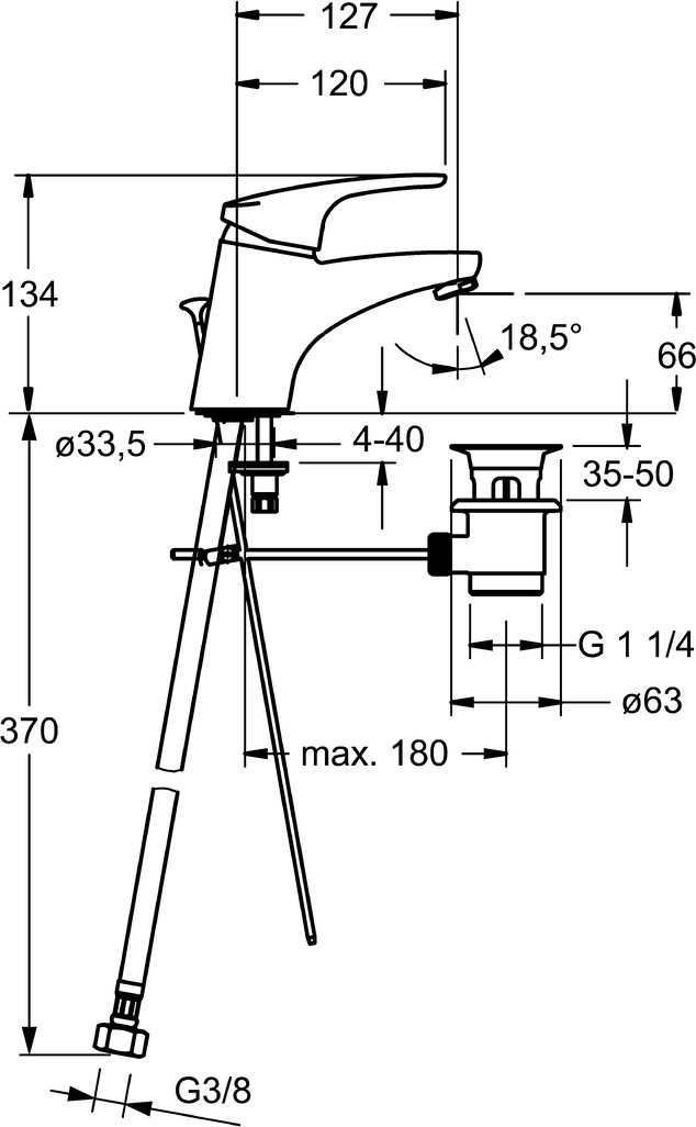 DN 15, Heißwasserversorgung max. 70°C, Arbeitsdruck 0,5-10 bar, Spar-Durchfluss bei 3 bar 4,2 l/min, Durchfluss bei 3 bar (mit Regler) 7,8 l/min, Anschlussgröße G3/8, Ausladung 127 mm, Sicherungseinrichtung (EN1717) AA, Geräuschklasse I (ISO 3822), Material Messing, Ø 4,8 Steuerpatrone mit keramischen Dichtscheiben zur Wassermengen- und Temperatureinstellung. Wasserbremse bei ca. 60% Wassermenge, feststehender Auslauf, Temperaturbegrenzer, Heißwassersperre einstellbar (im Lieferumfang enthalten), konstante Durchfussleistung unabhängig vom Fließdruck, Ablaufgarnitur mit Zugstange, Armaturenkörper aus entzinkungsbeständigem Messing (DZR), Rapid-Montagesystem, Hebel mit W+K-Kennzeichnung, Einhandbedienhebel/Griff, Anschluss über fexible Druckschläuche