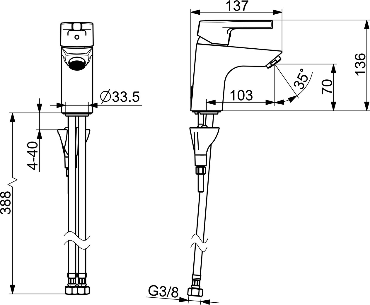 DN 15, Armaturenkörper aus entzinkungsbeständigem Messing (DZR), 3-S-Installation, Durchfluss bei 3 bar (Durchflussbegrenzer) 6 l/min, Heißwasserversorgung max. 80 °C, Hebel mit W+K-Kennzeichnung, Temperaturbegrenzer, Heißwassersperre einstellbar, Anschluss über flexible Druckschläuche G 3/8, Ø 3,5 mm classic-Steuerpatrone mit keramischen Dichtscheiben zur Wassermengen- und Temperatureinstellung, feststehender Auslauf, PCA-Strahlregler, konstante Durchflussleistung unabhängig vom Fließdruck