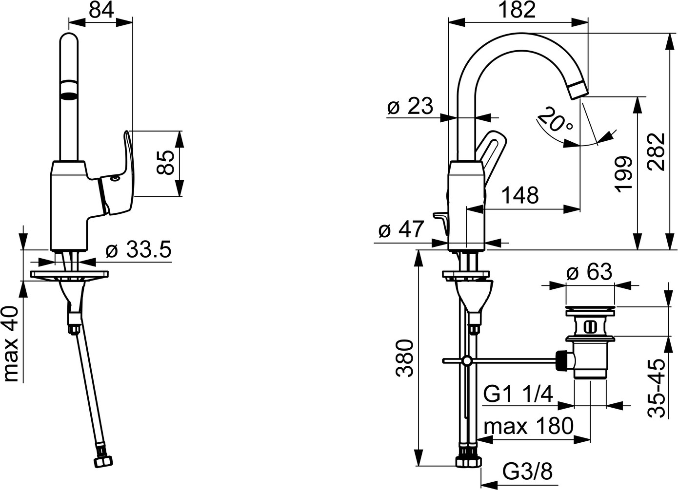 DN 15, Heißwasserversorgung max. 70°C, Arbeitsdruck 0,5-10 bar, Durchfluss bei 3 bar 6 l/min, Anschlussgröße G3/8, Schwenkbereich 120° (60° / 0°), Ausladung 148 mm, Sicherungseinrichtung (EN1717) AA, Geräuschklasse I (ISO 3822), Material Messing, 3S-Installation System für sichere und schnelle Montage, Armaturenkörper aus entzinkungsbeständigem Messing (DZR), Anschluss über fexible Druckschläuche, Ø 4,0 Steuerpatrone mit keramischen Dichtscheiben zur Wassermengen- und Temperatureinstellung, schwenkbarer Auslauf, Anschlag herausnehmbar, Strahlregler, Temperaturbegrenzer, Heißwassersperre einstellbar (im Lieferumfang enthalten), Hebel mit W+K-Kennzeichnung, Einhandbedienhebel/Griff, Ablaufgarnitur mit Zugstange