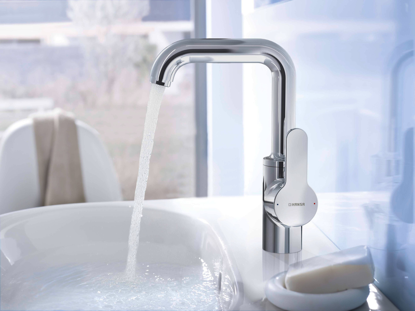 HANSA Waschtisch-Einhebelmischer HANSAPRIMO hoher Auslauf, Hebel seitlich, mit Ablaufgarnitur, Ausladung 142 mm, chrom