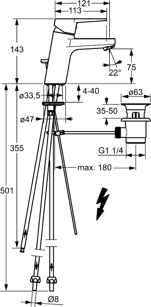 DN 15, Niederdruck, für offene Heißwasserbereiter, Heißwasserversorgung max. 80°C, Arbeitsdruck 0,5-5 bar, Anschlussgröße Ø 8 mm, Ausladung 121 mm, Sicherungseinrichtung (EN1717) AA, Material Messing, Ø 3,5 classic Steuerpatrone mit keramischen Dichtscheiben zur Wassermengen- und Temperatureinstellung, Ablaufgarnitur mit Zugstange, feststehender Auslauf, Temperaturbegrenzer, Heißwassersperre einstellbar (im Lieferumfang enthalten), Hebel mit W+K-Kennzeichnung, Einhandbedienhebel/Griff, Armaturenkörper aus entzinkungsbeständigem Messing (DZR), Rapid-Montagesystem, kristallklarer Laminarstrahl, Strahlregler, Anschluss über Kupferrohre