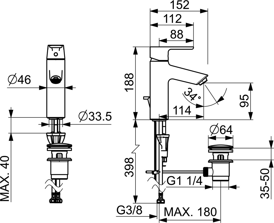 Armaturenkörper aus entzinkungsbeständigem Messing (DZR), 3S-Installation System für sichere und schnelle Montage, Durchfluss bei 3 bar (Durchflussbegrenzer) 6 l/min, Heißwasserversorgung max. +70 °C, Einhandbedienhebel/Griff, mit W+K-Kennzeichnung, Temperaturbegrenzer, Ablaufgarnitur mit Zugstange, Anschluss über flexible Druckschläuche (G 3/8), Sicherungseinrichtung (EN 1717) AA, Ø 3.0 Steuerpatrone mit keramischen Dichtscheiben zur Wassermengen- und Temperatureinstellung, feststehender Auslauf, Strahlreglertyp PCA konstante Durchflussleistung unabhängig vom Fließdruck