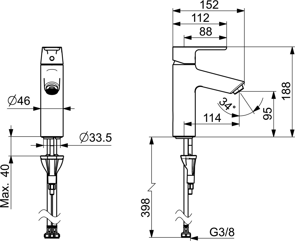 Armaturenkörper aus entzinkungsbeständigem Messing (DZR), 3S-Installation System für sichere und schnelle Montage, Durchfluss bei 3 bar (Durchflussbegrenzer) 6 l/min, Heißwasserversorgung max. +70 °C, Einhandbedienhebel/Griff, mit W+K-Kennzeichnung, Temperaturbegrenzer, Anschluss über flexible Druckschläuche (G 3/8), Sicherungseinrichtung (EN 1717) AA, Ø 3.0 Steuerpatrone mit keramischen Dichtscheiben zur Wassermengen- und Temperatureinstellung, feststehender Auslauf, Strahlreglertyp PCA konstante Durchflussleistung unabhängig vom Fließdruck