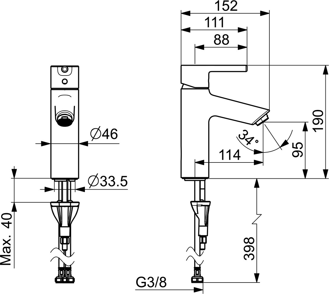 Armaturenkörper aus entzinkungsbeständigem Messing (DZR), 3S-Installation System für sichere und schnelle Montage, Durchfluss bei 3 bar (Durchflussbegrenzer) 6 l/min, Heißwasserversorgung max. +70 °C, Einhandbedienhebel/Griff, mit W+K-Kennzeichnung, Temperaturbegrenzer, Anschluss über flexible Druckschläuche (G 3/8), Sicherungseinrichtung (EN 1717) AA, Ø 3.0 Steuerpatrone mit keramischen Dichtscheiben zur Wassermengen- und Temperatureinstellung, feststehender Auslauf, Strahlreglertyp PCA konstante Durchflussleistung unabhängig vom Fließdruck
