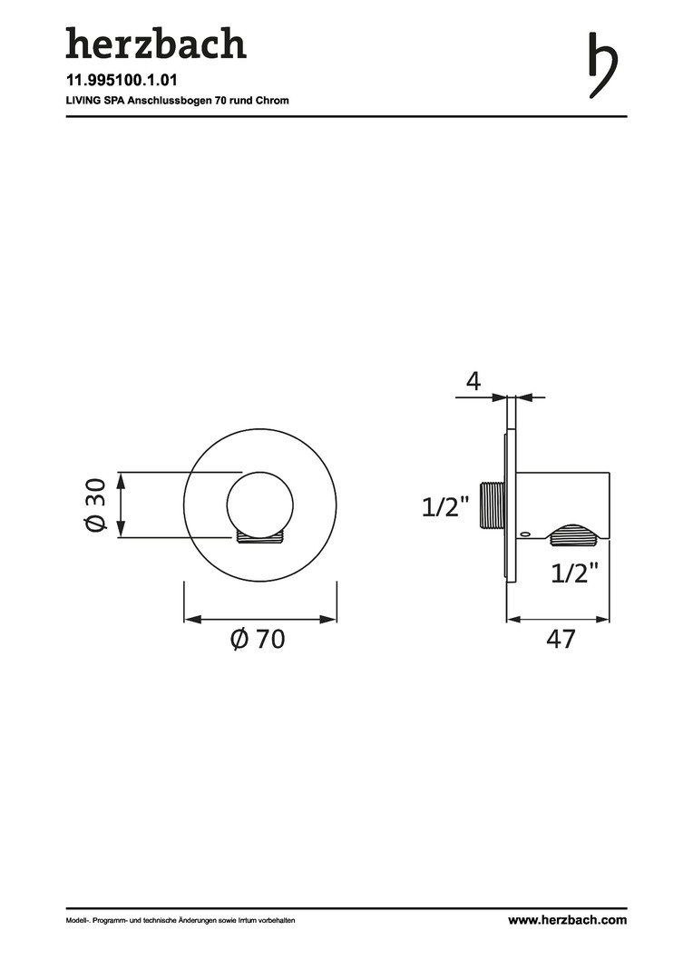 Herzbach Anschlussbogen Living Spa seven round 1/2", Rosette d= 70mm, chrom