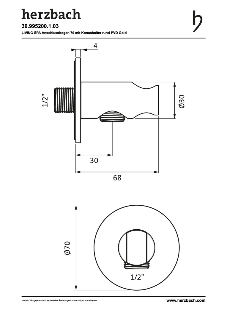 Herzbach Anschlussbogen Living Spa seven round 1/2", Rosette d= 70mm, mit Konushalter, PVD gold