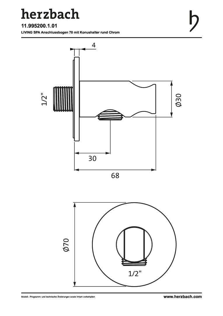 Herzbach Anschlussbogen Living Spa seven round 1/2", Rosette d= 70mm, mit Konushalter, chrom