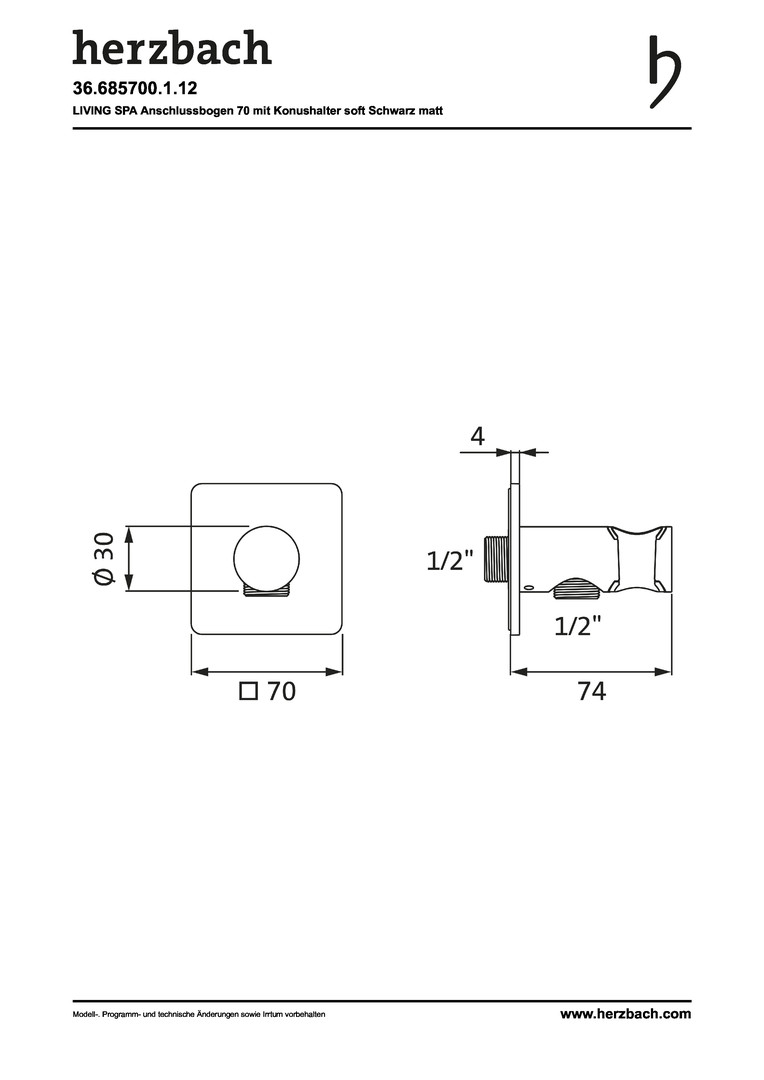 Herzbach Brauseanschlussbogen Living Spa seven soft 1/2", Rosette 70x70mm, Konushalter, chrom HF36685700101
