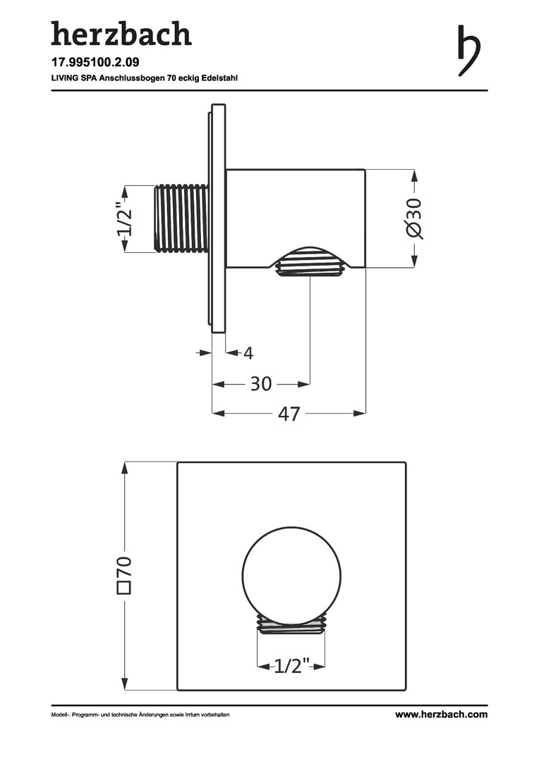 Herzbach Brauseanschlussbogen Living Spa seven square 1/2", Rosette 70x70mm, Edelstahl gebürstet