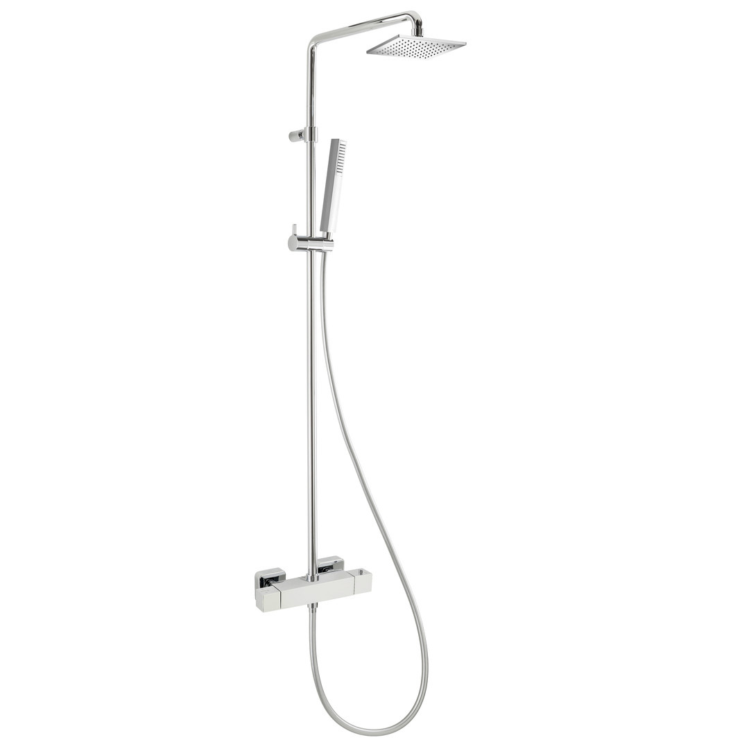 Thermostat eckig mit Ab-/Umstellventil, LOGIC-Easyclean Thermostatkartusche, Heißwassersperre bei 38°C, Brause-Anschlussgewinde 1/2", Regenbrause eckig, CLEAN EFFECT, Gesamthöhe 1207 mm, Brauserohr rund kürzbar, Brausearm 350 mm (nicht schwenkbar), Konusgleiter höhenverstellbar, mit Brauseschlauch 1500mm, mit Stabhandbrause Kunststoff eckig