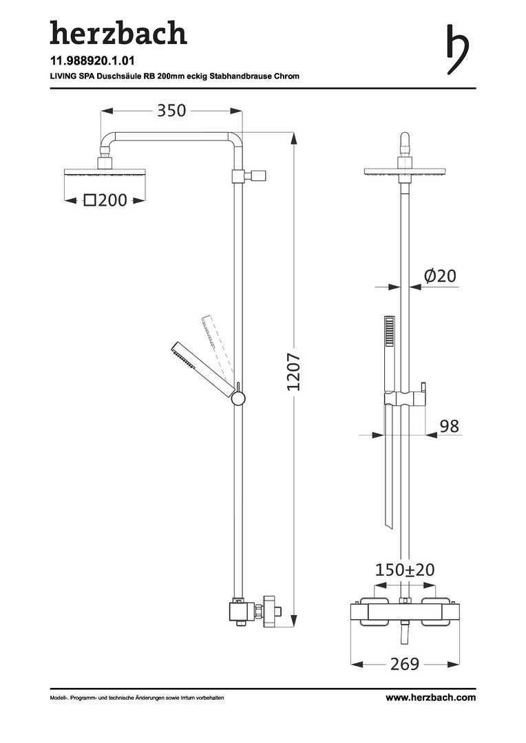 Herzbach Duschsäule Living Spa square 200 mm, mit Brause-Thermostat und Stabbrause, chrom HF11988920101