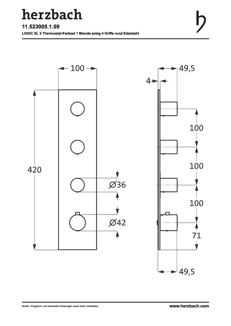 Herzbach Fertigmontageset Logic XL 3 Thermostat-Modul, 1 Blende eckig, 4 Griffe rund, Edelstahl gebürstet