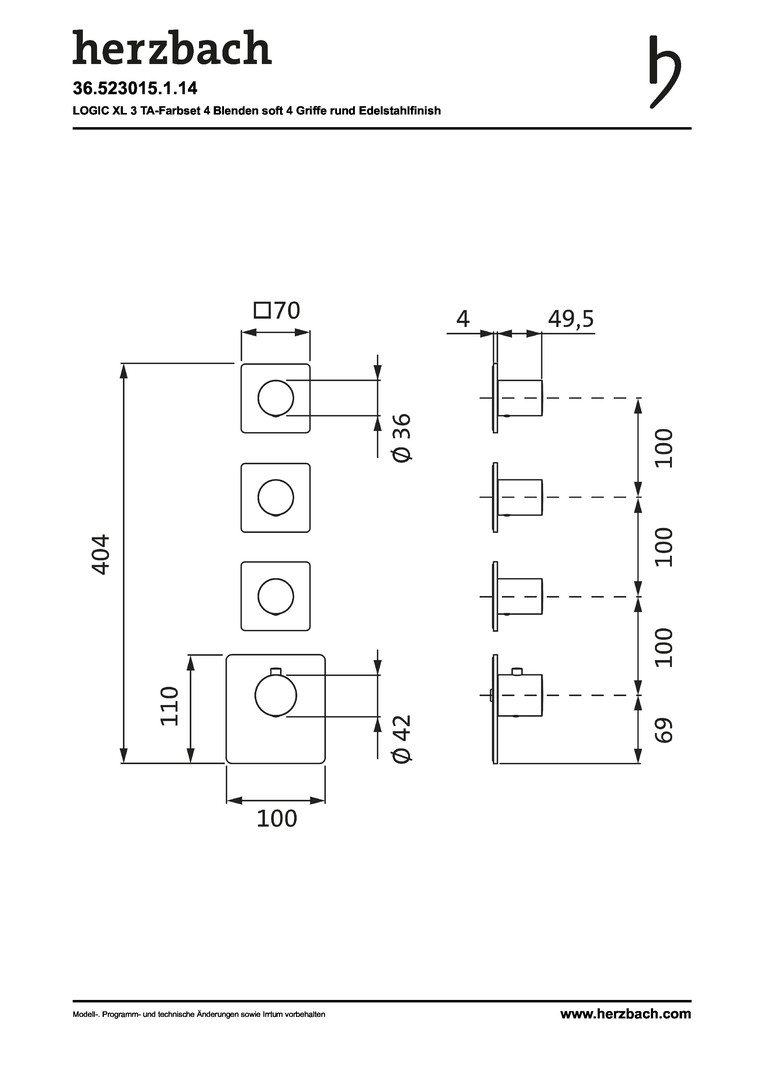 Herzbach Fertigmontageset Logic XL 3 Thermostat-Modul, 4 Blenden soft, Griffe rund, Edelstahlfinish HF36523015114